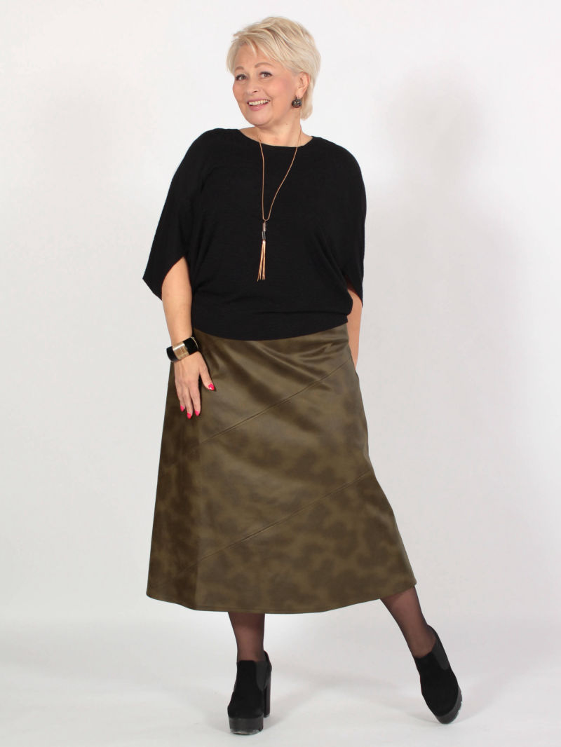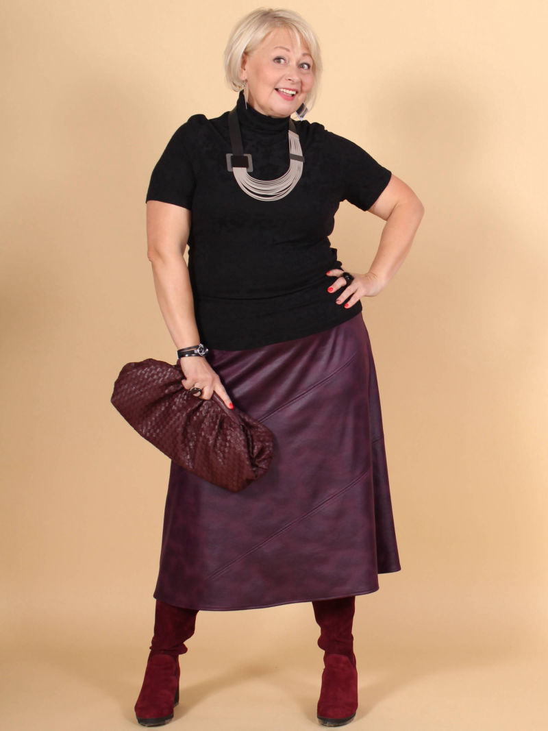 Кожаная юбка-трапеция это сегодня базовый и самый желанный элемент женского гардероба. Элегантный крой с расширяющимся к полу подолом красив и универсален. Он подходит абсолютно всем дамам, даже если формы далеки от модельных. Форма юбки-трапеции визуально уменьшает талию, удлиняет ноги и гармонично подчеркивает достоинства фигуры. Наша юбка выполнена из приятной пластичной экокожи. Юбка без застёжки, пояс на резинке. Перед и спинка оформлены косыми подрезами и отделочными строчками. Подкладка в юбке трикотажная. Сплошная красота и никаких компромиссов с удобством и функциональностью. plus size/плюс сайз/большие размеры/для полных женщин/надин оверсайз для девушек/белорусская одежда женская/Беларусь/офисное женское/свитер Белоруссия/oversize/кожа/экокожа/кожзам