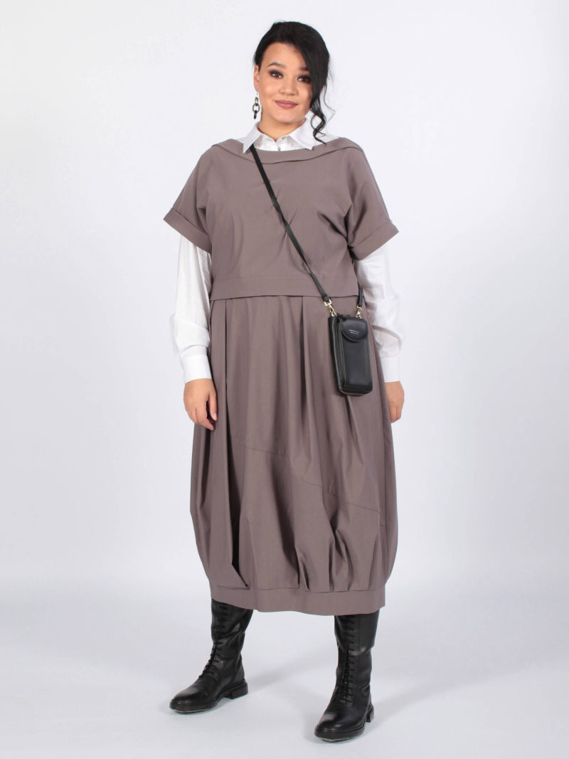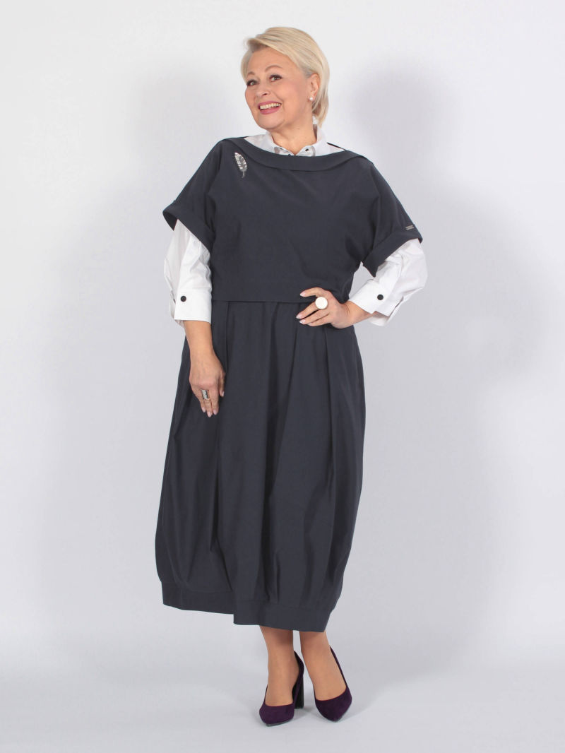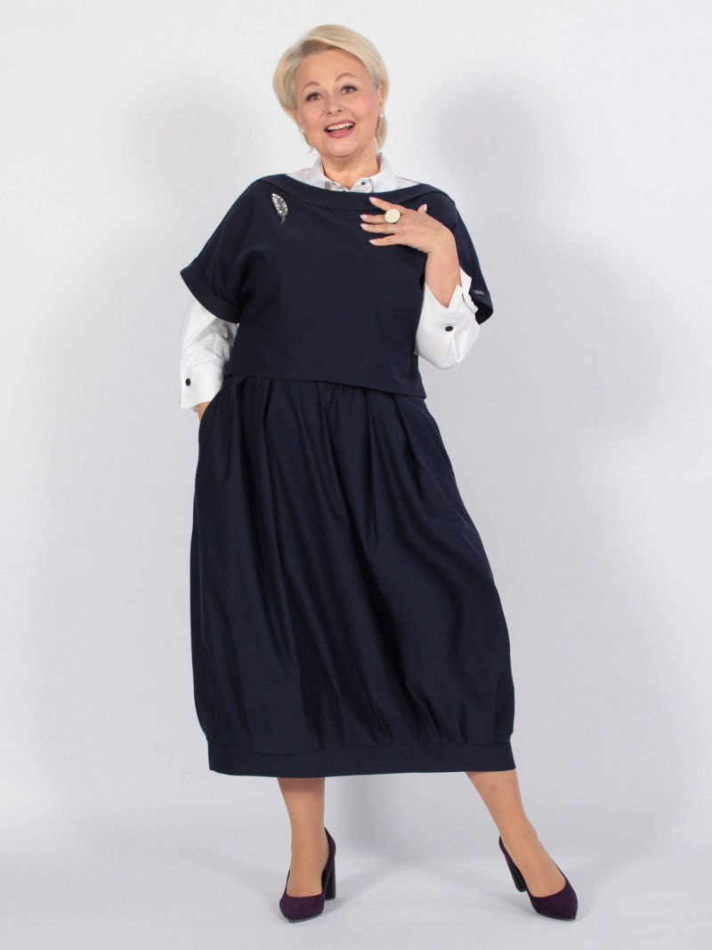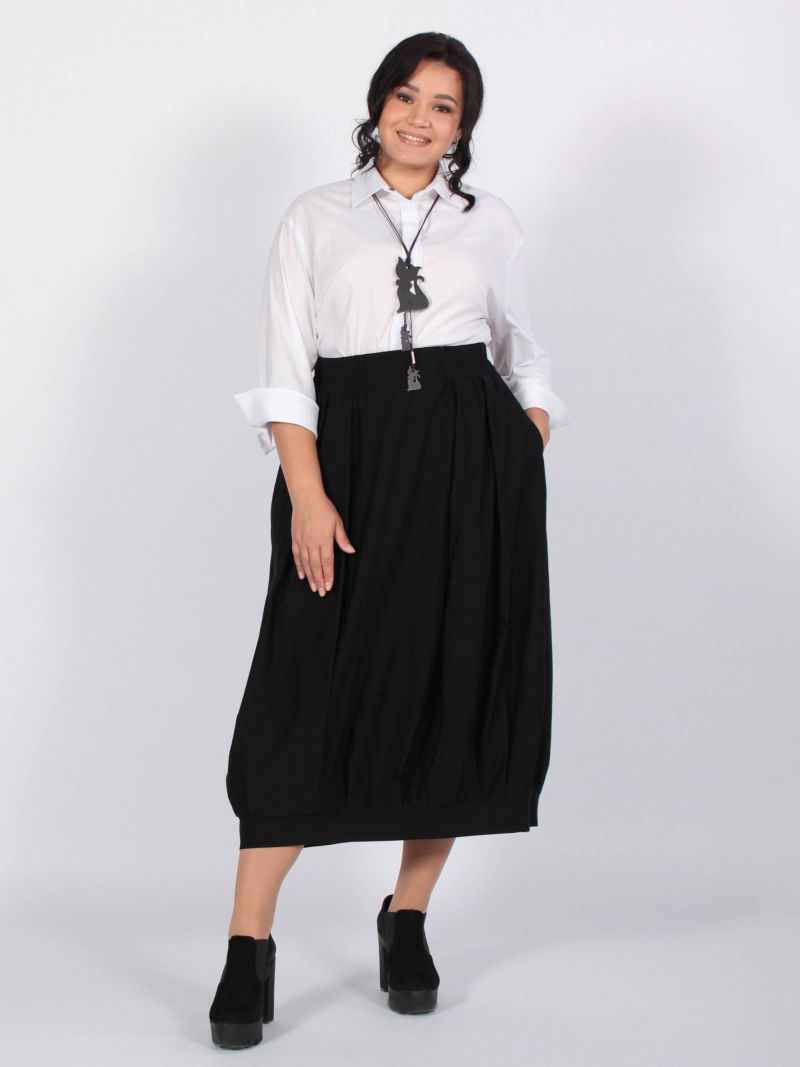 Юбка-миди бочкообразной формы из смесовой ткани с эластаном. Глубокие складки у пояса и защипы по низу изделия формируют силуэт и создают манящую игру свето-тени. Эластичная притачная планка по низу юбки фиксирует объем и дисциплинирует образ. Юбка с широким притачным поясом на эластичной резинке, в боковых швах выполнены удобные карманы. plus size/плюс сайз/большие размеры/для полных женщин/надин оверсайз для девушек/белорусская одежда женская/Беларусь/офисное женское Белоруссия/oversize