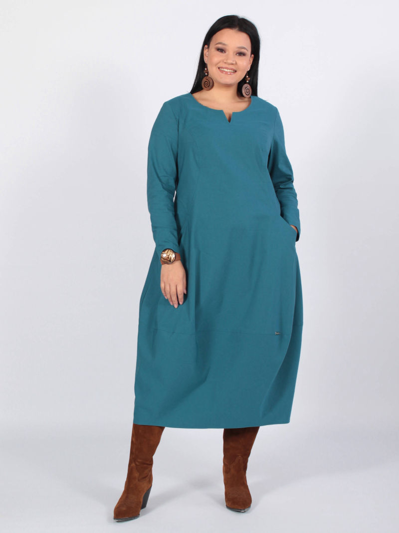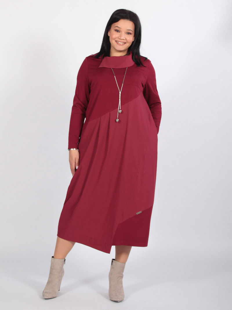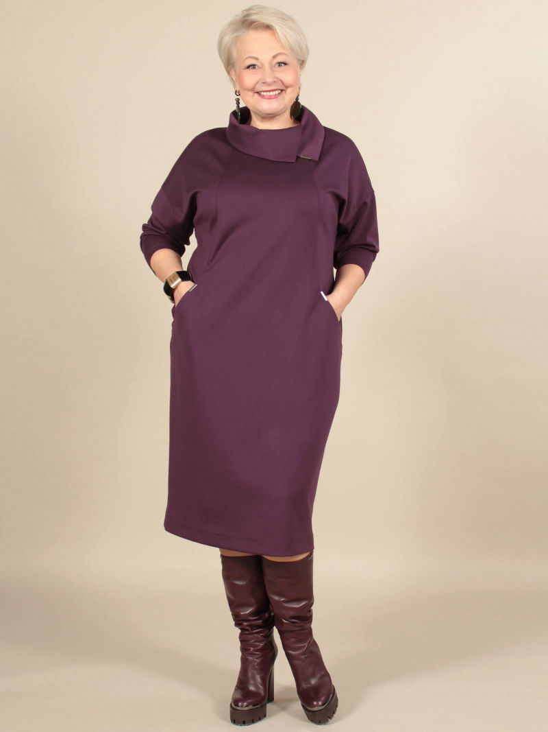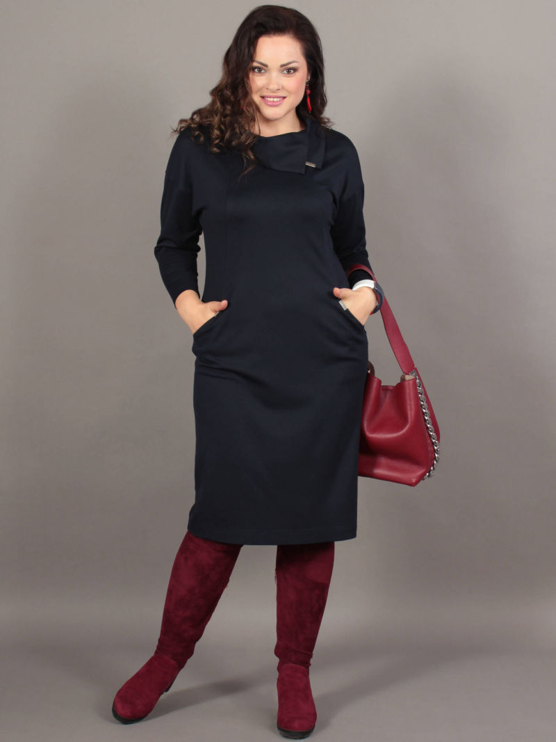 Уютное стильное платье средней длины из трикотажного футера с оригинальным дизайном. Горловина округлой формы-лодочка оформлена тонкой отделочной планкой в цвет. Линия плеча слегка спущена, рукав широкий, бочкообразный, длиной 3/4. Удобные вертикальные карманы выполнены в швах рельефов переда. По низу платья есть небольшие разрезы. Такое платье подойдет девушке, девочке на любой тип фигур больших размеров (груша, яблоко, и другие). Стильное платье из хлопка и полиэстера для полных женщин смотрится не только по-деловому, но и невероятно женственно, комфортно в носке и легкое в уходе. Платье не мнется, не деформируется при стирке, приятно к телу, а за счет небольшого стрейча - не сковывает движения. Платье подойдет на работу, в офис, в школу, свидание, на встречу с подружками, для фотосессии, на день рождения. Его легко сочетать как с любой обувью (балетки, сапоги, туфли, ботинки), так и с любой верхней одеждой (с кожанкой, пальто, тренчем или курткой). Платье комфортно носить осенью, весной, и зимой. Такой вариант платья подойдет как для дочки, так и для мамы, бабушки