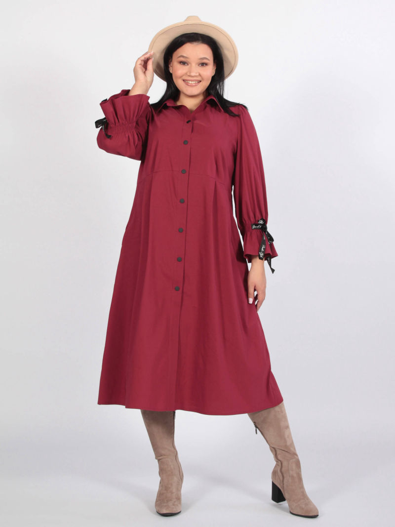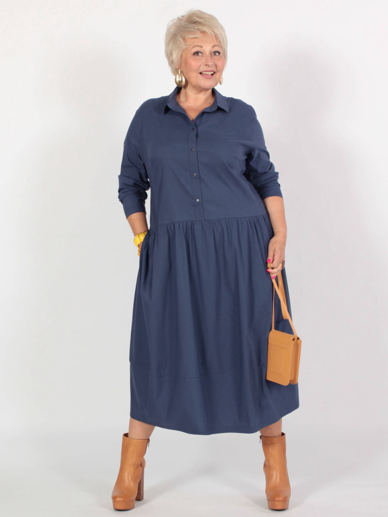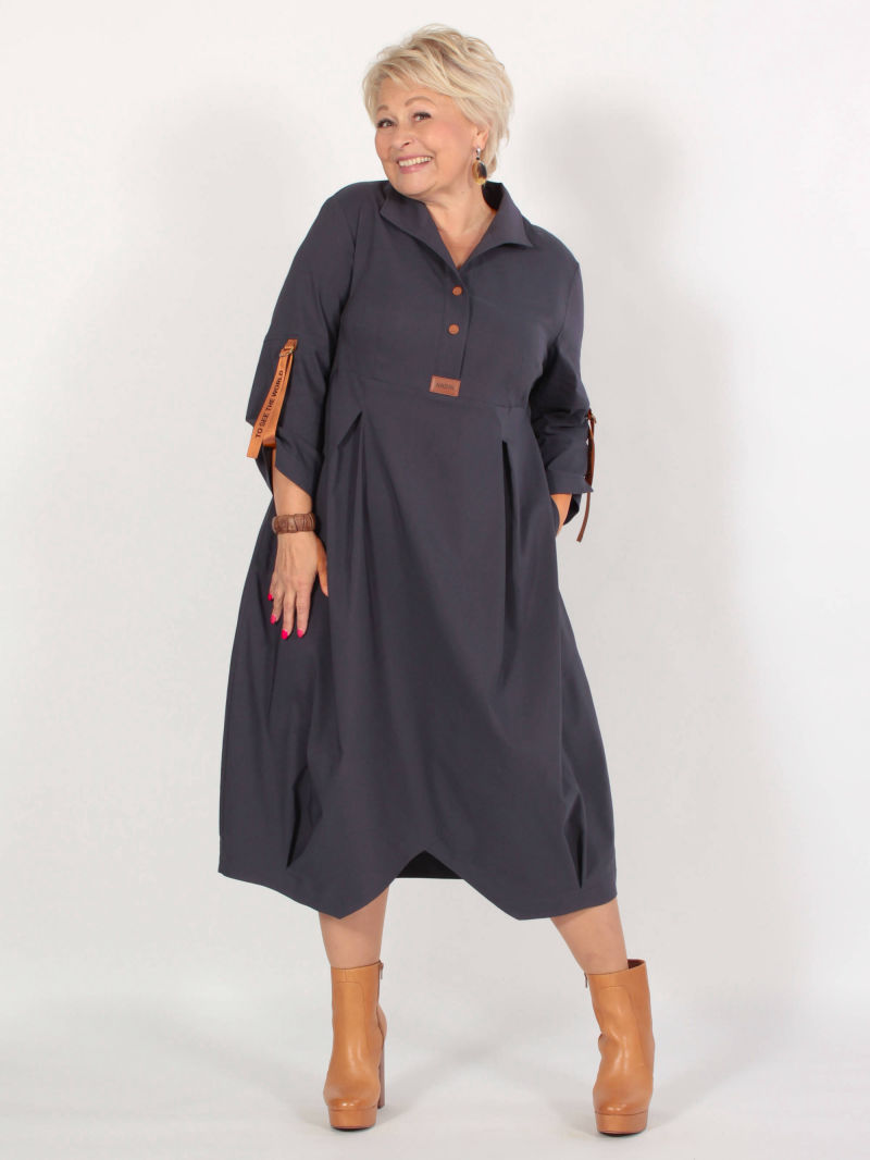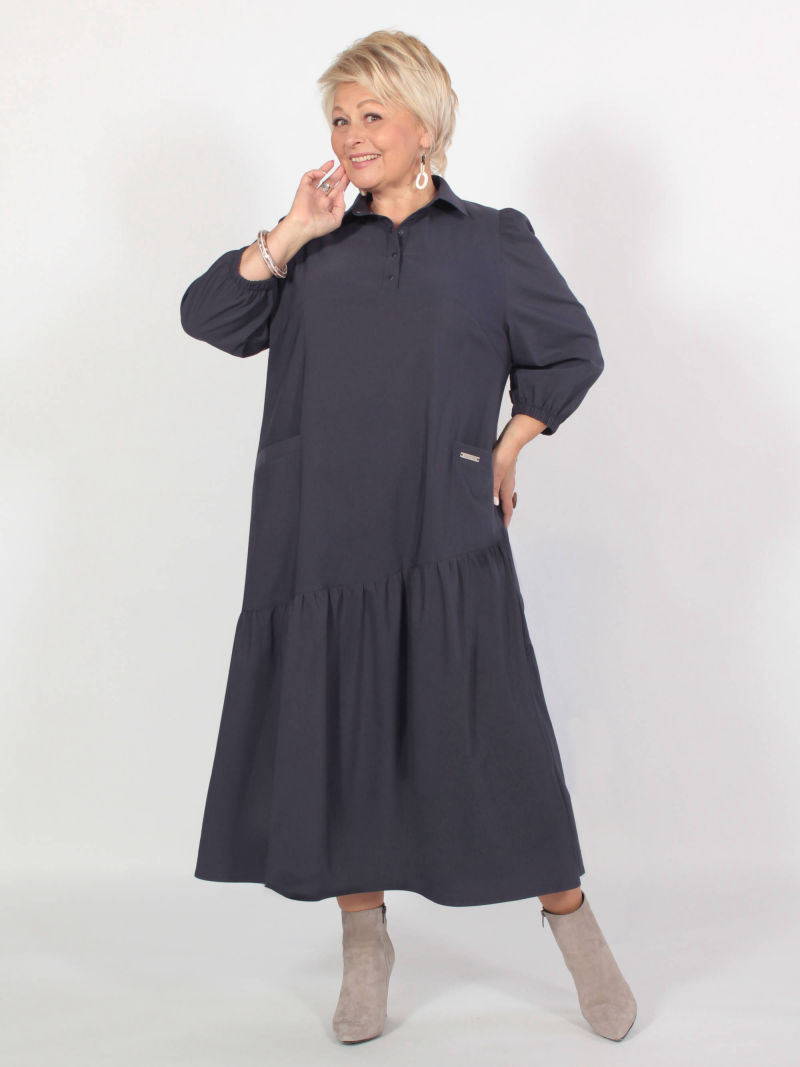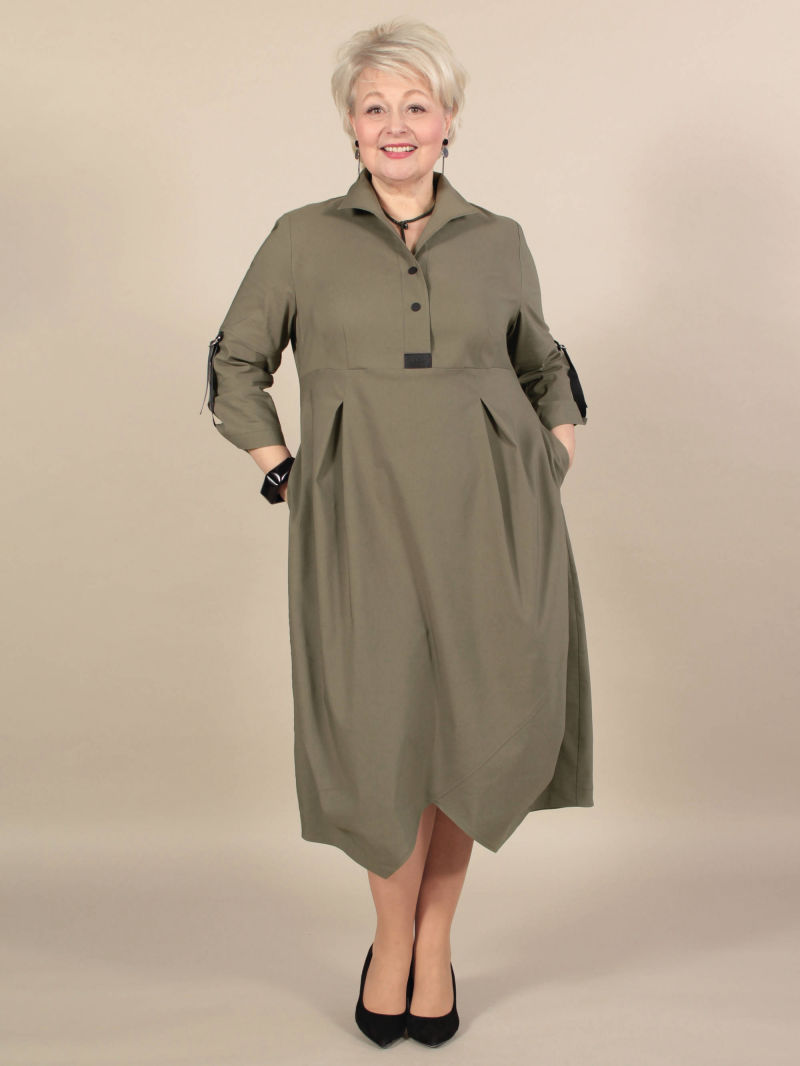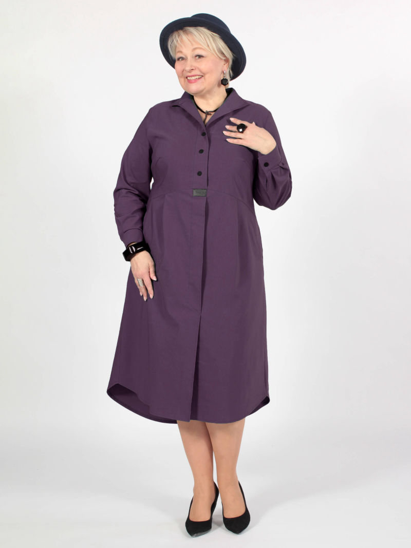 Стильное платье из эластичной смесовой ткани. Воротник-апаш с застежкой на кнопки завершается декоративным фирменным шевроном из экокожи. Фигурный дугообразный подрез выше линии талии визуально вытягивает фигуру и удлинняет ноги, а изогнутая форма низа подчеркивает динамику модели. Перед платья декорирован мягкими складками и вертикальной складкой-шлицей по центру. Вдоль бокового шва выполнены удобные карманы. По спинке вертикальная складка декорирована двумя отделочными кнопками и разрезом-шлицей. Линия плеча естественная, рукав полной длины на притачной манжете с застежкой на кнопку.plus size/плюс сайз/большие размеры/для полных женщин/надин оверсайз для девушек/белорусская одежда женская/Беларусь/офисное женское/свитер Белоруссия/oversize/юбка