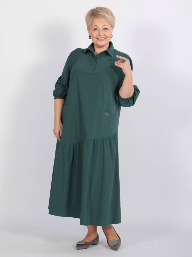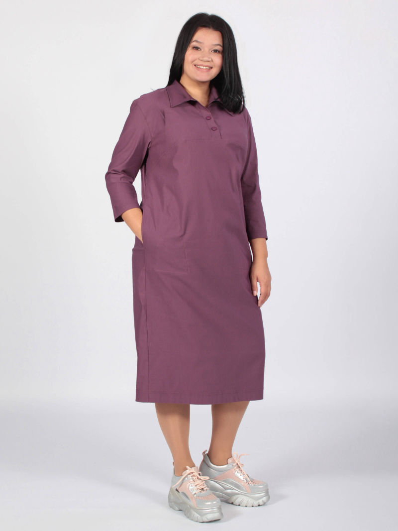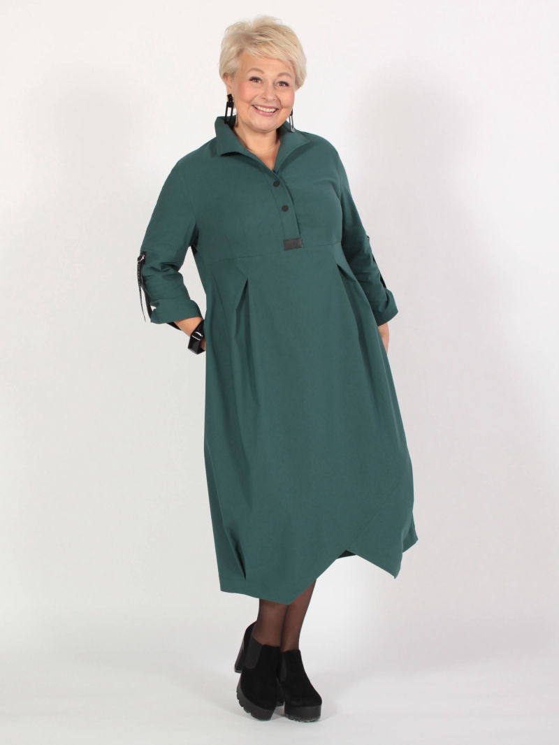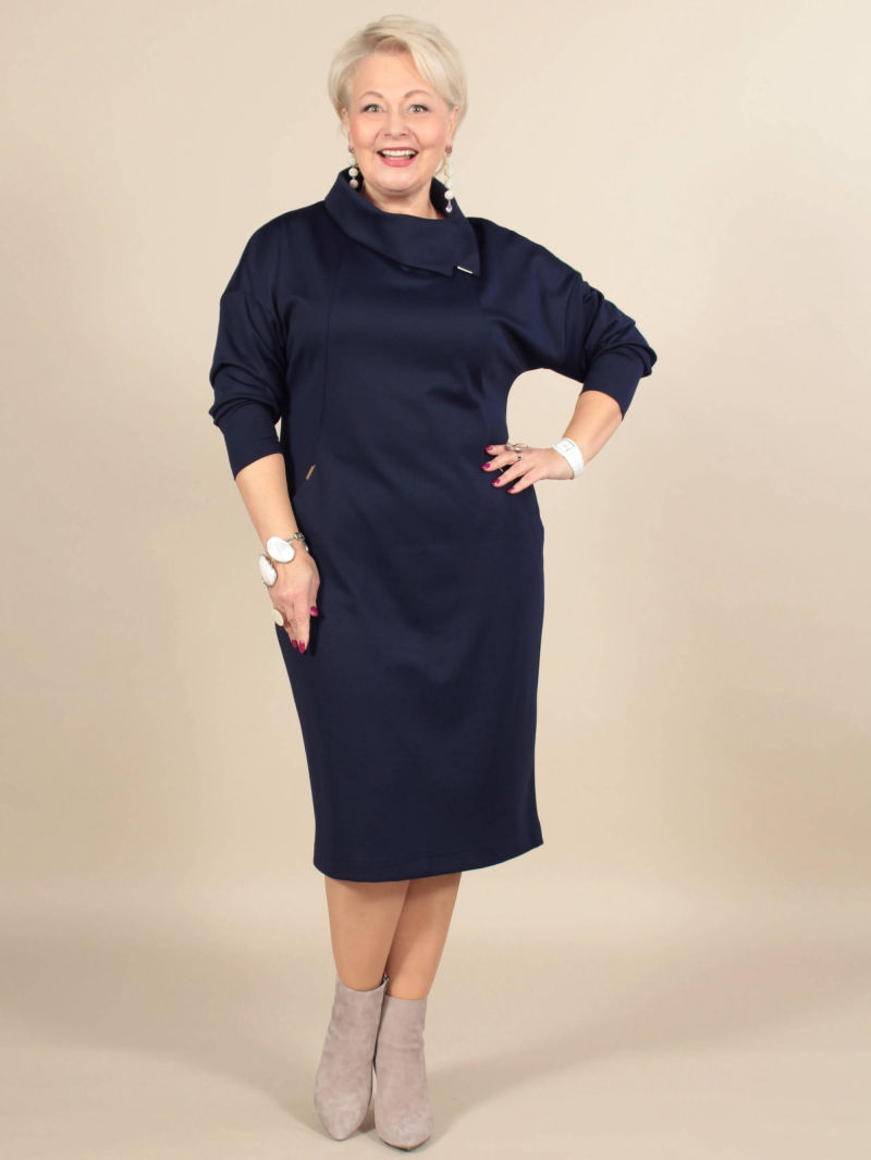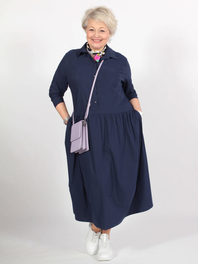 Стильное платье из эластичной смесовой ткани. Воротник-апаш с застежкой на кнопки завершается декоративным фирменным шевроном из экокожи. Фигурный дугообразный подрез выше линии талии визуально вытягивает фигуру и удлинняет ноги, а изогнутая форма низа подчеркивает динамику модели. Перед платья декорирован мягкими складками и вертикальной складкой-шлицей по центру. Вдоль бокового шва выполнены удобные карманы. По спинке вертикальная складка декорирована двумя отделочными кнопками и разрезом-шлицей. Линия плеча естественная, рукав полной длины на притачной манжете с застежкой на кнопку.plus size/плюс сайз/большие размеры/для полных женщин/надин оверсайз для девушек/белорусская одежда женская/Беларусь/офисное женское/свитер Белоруссия/oversize/юбка