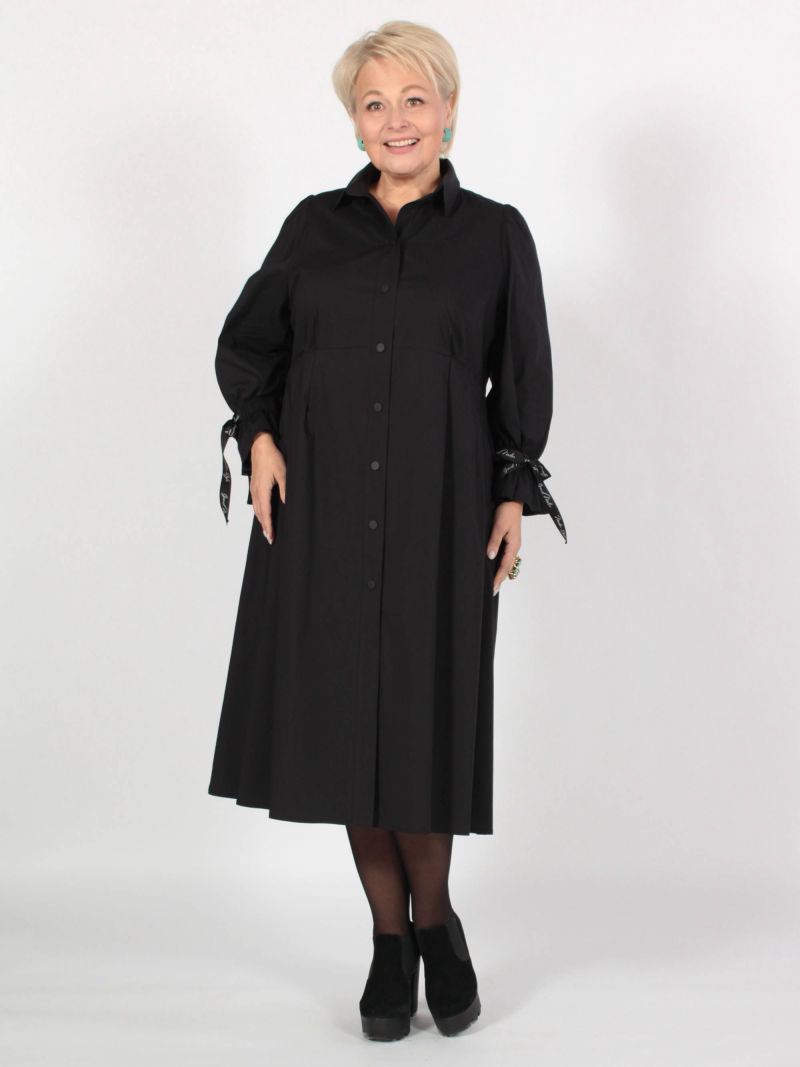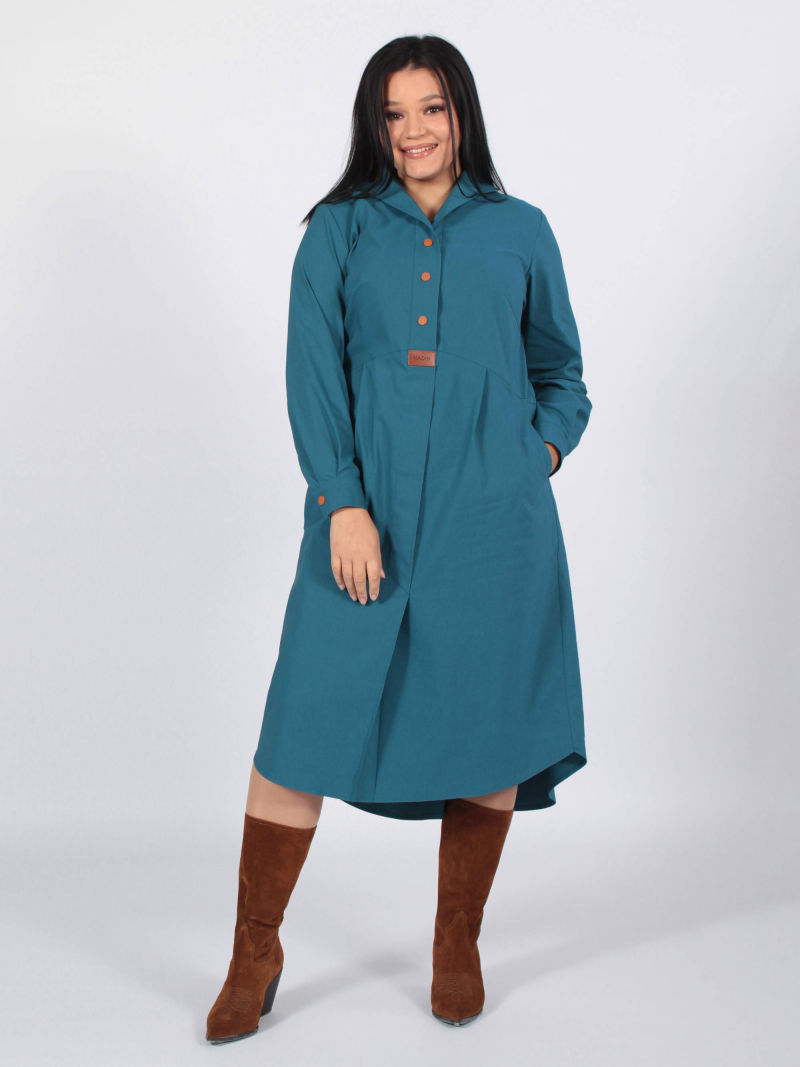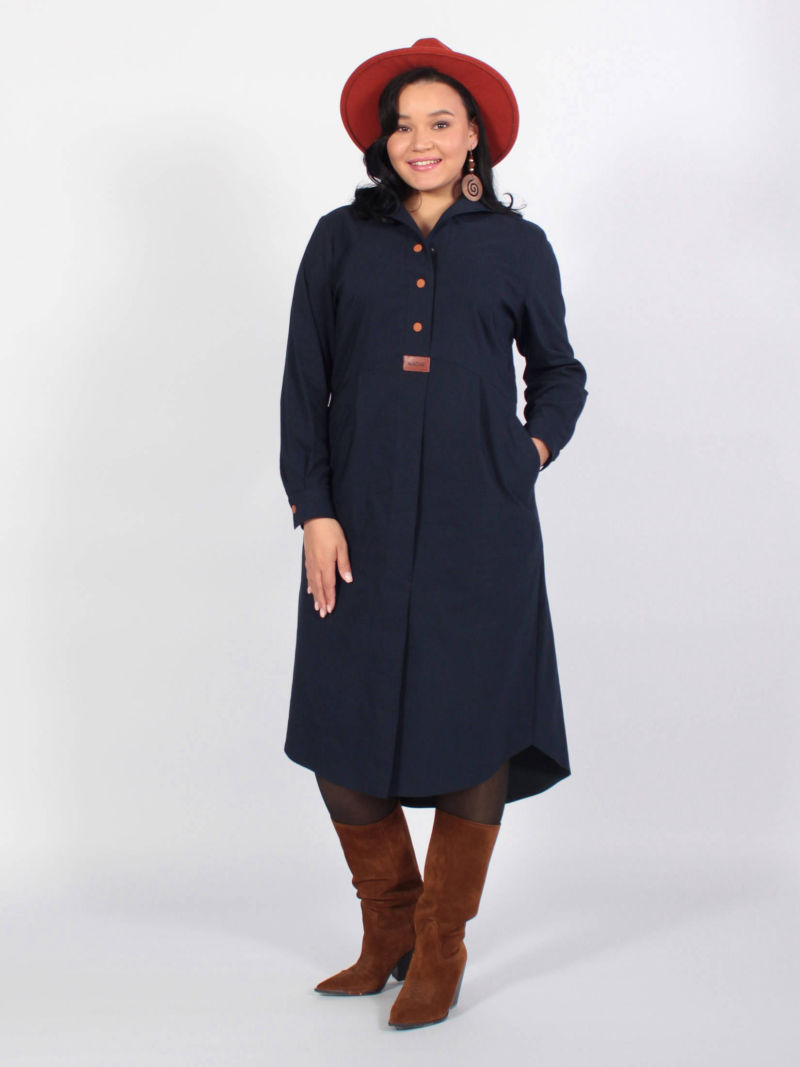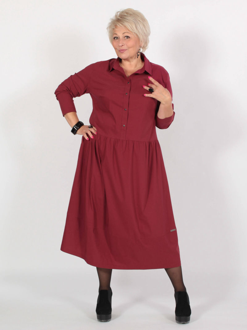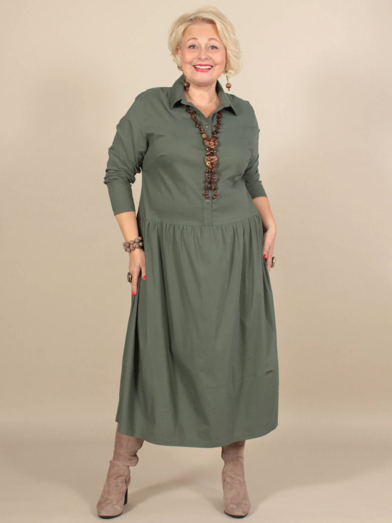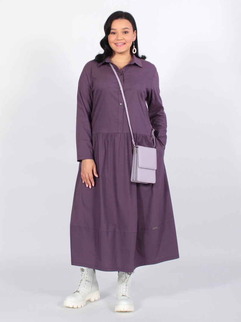 Стильное платье из эластичной смесовой ткани. Воротник-апаш с застежкой на кнопки завершается декоративным фирменным шевроном из экокожи. Фигурный дугообразный подрез выше линии талии визуально вытягивает фигуру и удлинняет ноги, а изогнутая форма низа подчеркивает динамику модели. Перед платья декорирован мягкими складками и вертикальной складкой-шлицей по центру. Вдоль бокового шва выполнены удобные карманы. По спинке вертикальная складка декорирована двумя отделочными кнопками и разрезом-шлицей. Линия плеча естественная, рукав полной длины на притачной манжете с застежкой на кнопку.plus size/плюс сайз/большие размеры/для полных женщин/надин оверсайз для девушек/белорусская одежда женская/Беларусь/офисное женское/свитер Белоруссия/oversize/юбка