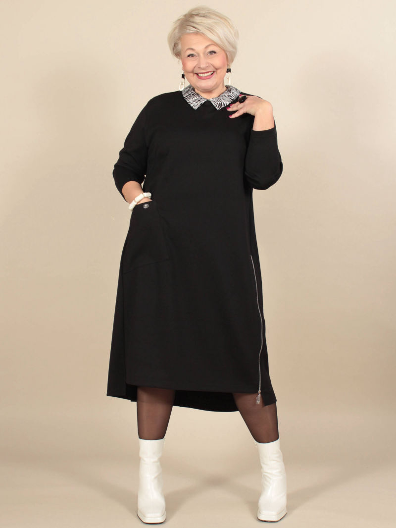 Модное молодёжное романтическое платье с контрастным воротничком. Платье А-образного силуэта из приятного трикотажа средней плотности. Платье асимметричное, с одной стороны у него есть удобный карман, с другой стороны в боковом шве металлическая разъёмная молния. Отличный вариант для деловых встреч и для офиса.