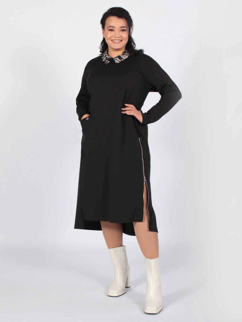 Комфортное и современное платье из трикотажного футра в стиле sport chic. Модель декорирована объемным настрочным карманом из отделочного материала под кожу и металлофурнитурой. Необработанные срезы в изделии подчеркивают свободный бунтарский образ модели. Линия плеча слегка спущена, рукав длиной 7/8 с притачной отделочной манжетой по низу, необработанный срез которой формирует эффектный жгутик. Мягкое заужение к низу платья достигается двумя вытачками по переду и спинке. plus size/плюс сайз/большие размеры/для полных женщин/надин оверсайз для девушки/белорусская одежда женская/Беларусь/Белоруссия/oversize/юбка/нарядное вечернее праздничное черное/осеннее/весеннее/туника удлиненная/женское летнее/платье на Новый год женское 2023/платья на выпускной 9 и 11 класс/8 марта/для подростка