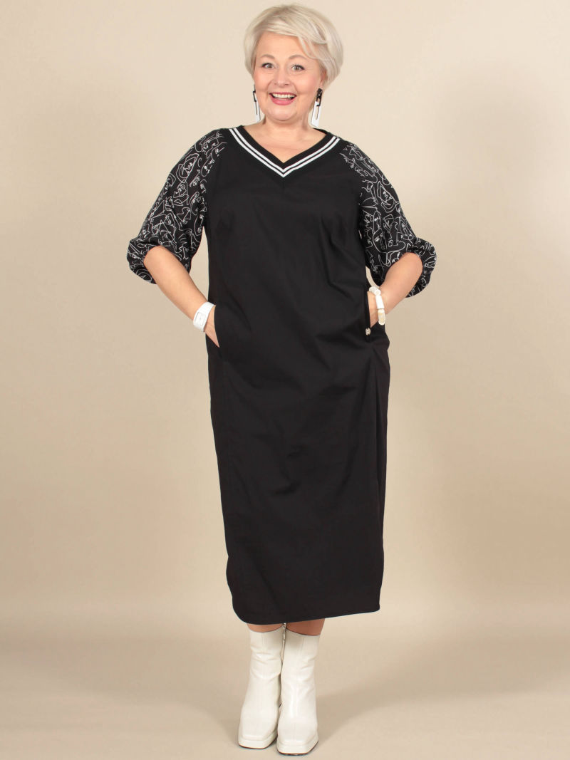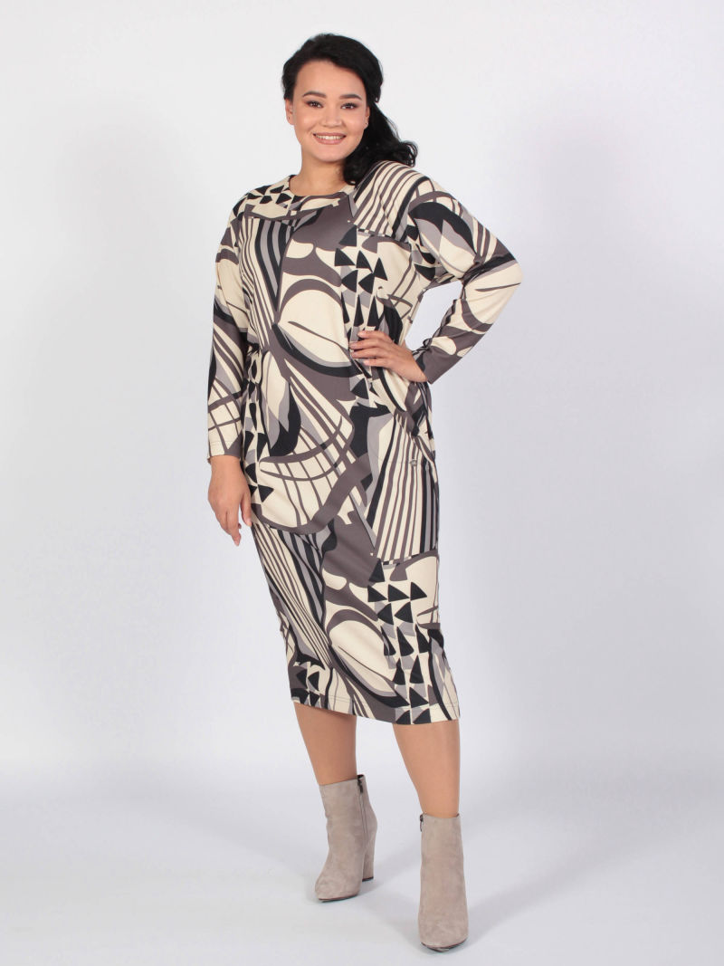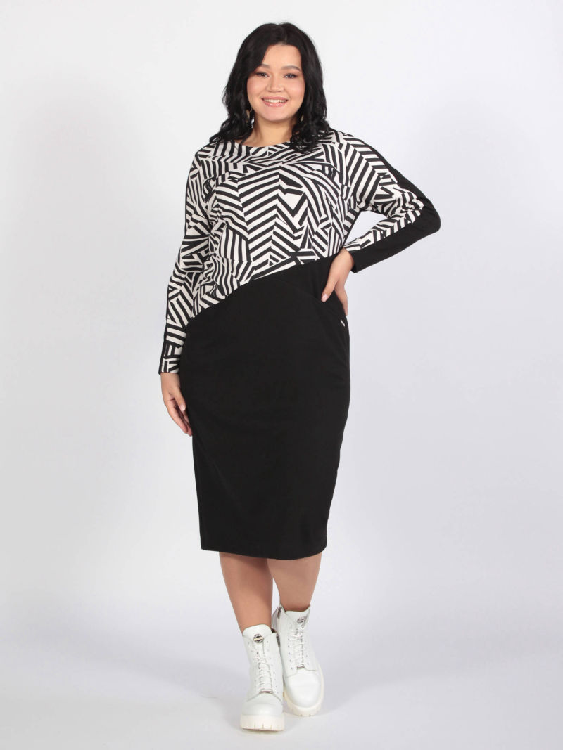 Базовое платье-футляр полуприлегающего силуэта средней длины из смесового трикотажного полотна. Комбинация гладкокрашенного и принтованного трикотажа придает динамику и характер модели. Горловина округлой формы, линия плеча естественная рукав полной длинны зайженный к низу. В косых подрезах переда выполнены удобные карманы. Верхний шов рукава смещенный на перед формирует тонкий иззящный лампас, визуально стройнит и скульптурирует силуэт модели.Plus size/плюс сайз/большие размеры/для полных женщин/надин оверсайз для девушек/белорусская одежда женская/Беларусь/офисное женское Белоруссия/oversize/турецкая ткань/для подростка школа/для девочки школьная/туника/ блузка женская/ брюки женские/