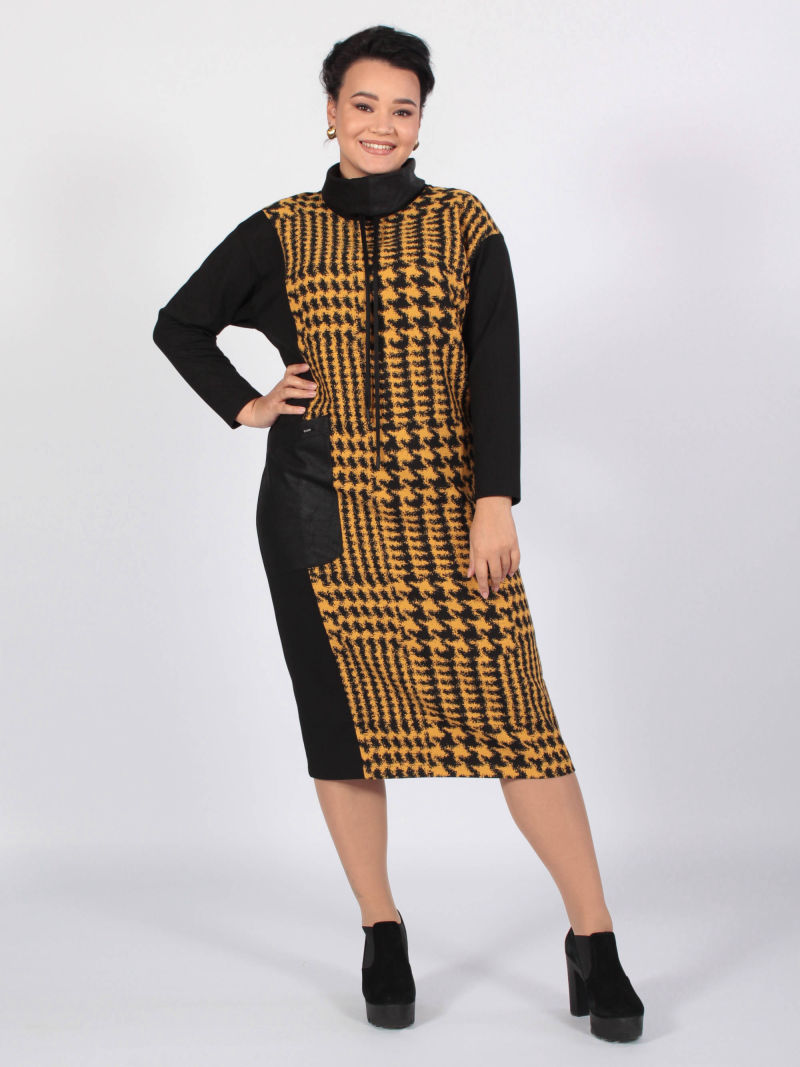 Платье полуприлегающего силуэта, выполнено из трикотажного полотна и текстиля в клетку модного горчичного цвета. Обе ткани тактильно приятные, со стрейчем. Модель декорирована настрочным карманом и воротником-стойкой из трикотажа с эффектом экокожи. Объем стойки регулируется отделочными шнурками. Матовая металлическая фурнитура черного цвета удачно завершает образ. Рукав полной длины, зауженный к низу, линия плеча слегка спущена. Plus size/плюс сайз/большие размеры/для полных женщин/надин оверсайз для девушек/белорусская одежда женская/Беларусь/офисное женское Белоруссия/oversize/турецкая ткань/удлиненный/легкий сарафан/юбка/для подростка школа/для девочки школьная/туника удлиненная/вечернее весеннее осеннее/праздничное.
