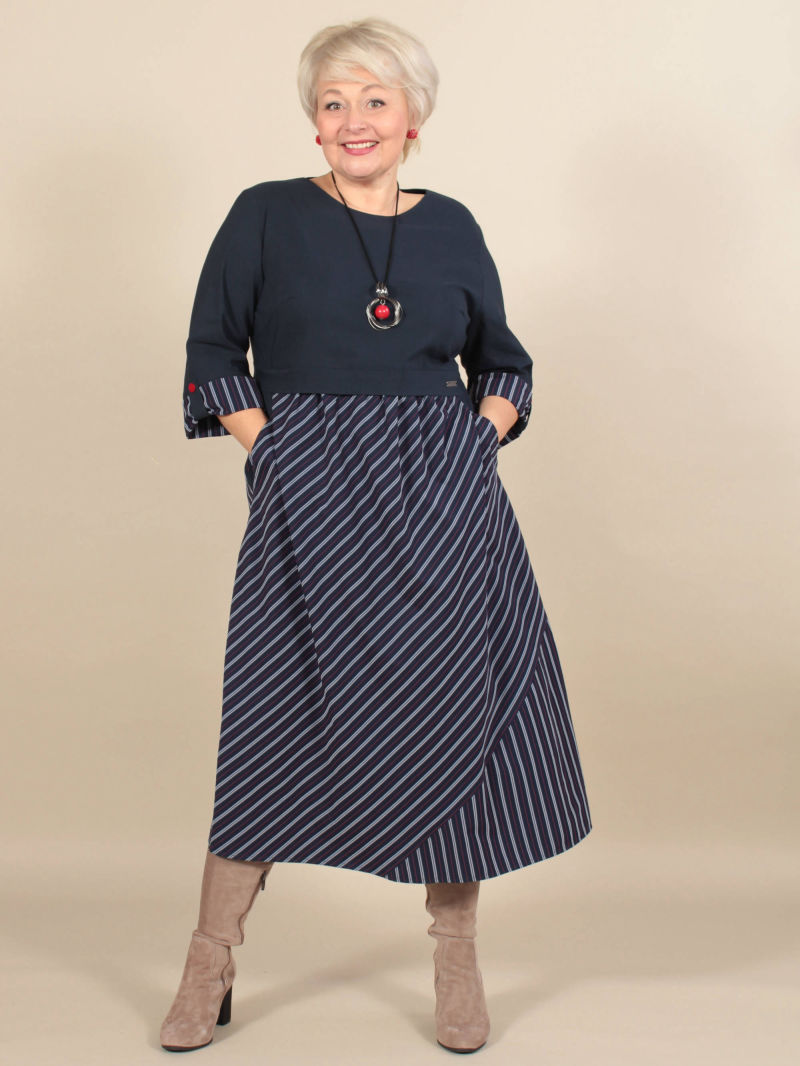 Удлиненное платье X-образного силуэта с подрезом под грудью и притачной юбкой с легкой сборкой. В модели использована комбинация однотонного материала и ткани в полоску. Юбка, скроенная по-косой, формирует характер модели, а вертикальный подрез по низу придает дополнительную динамику. Благодаря хорошей эластичности материала, платье сядет на любую фигуру. Горловина округлая, рукав втачной, длинной 3/4, с притачной манжетой и патой с застежкой на кнопку. По переду выполнены удобные карманы.