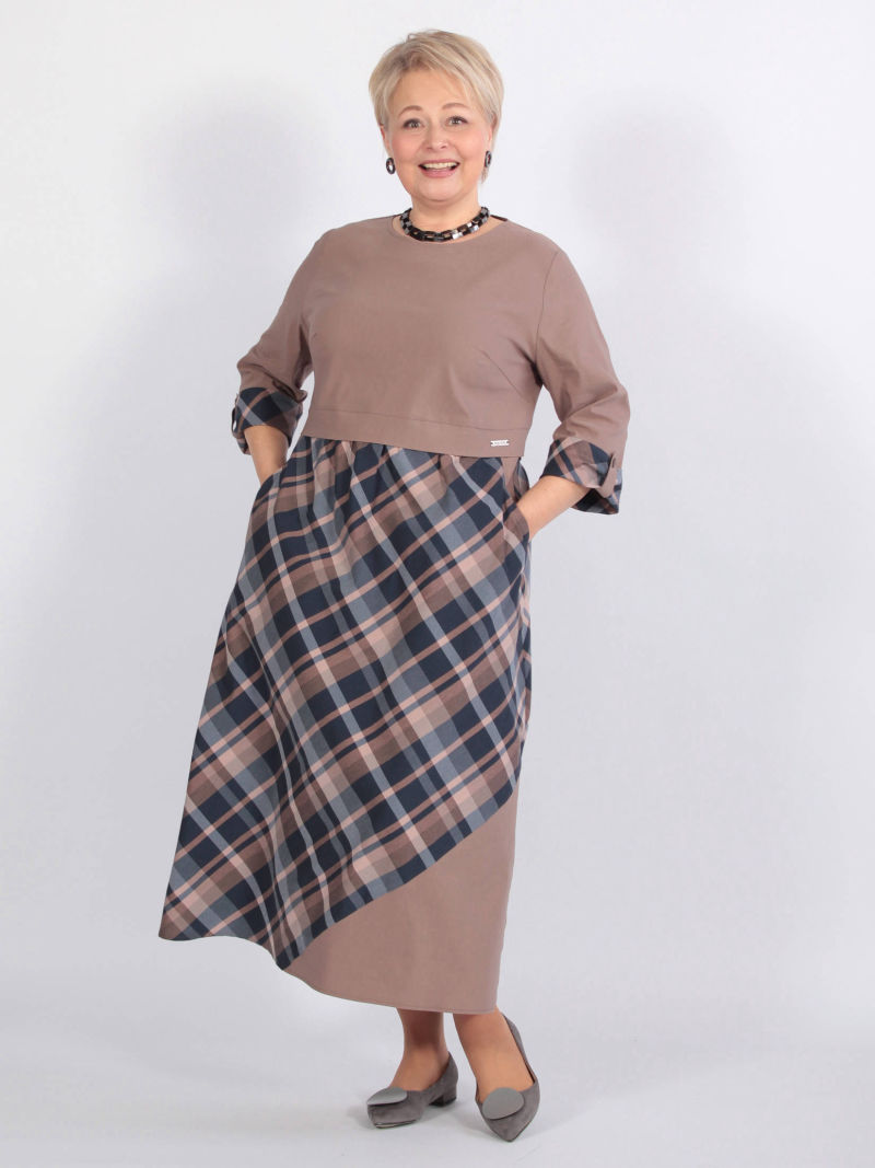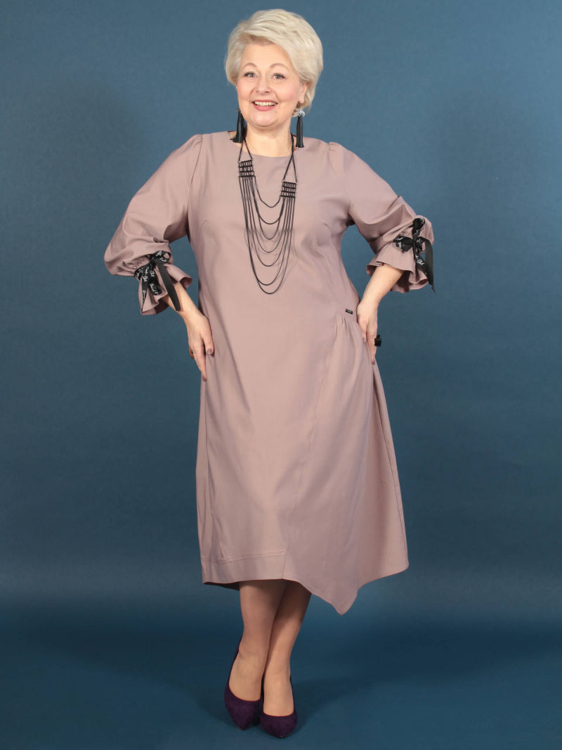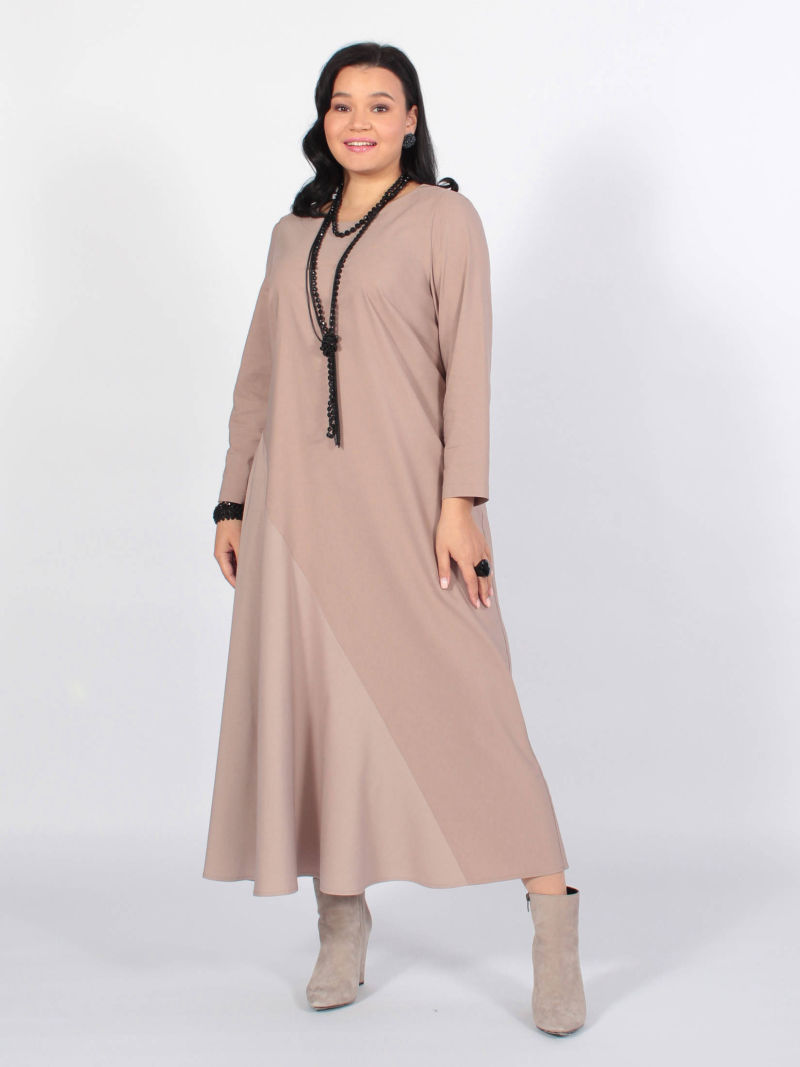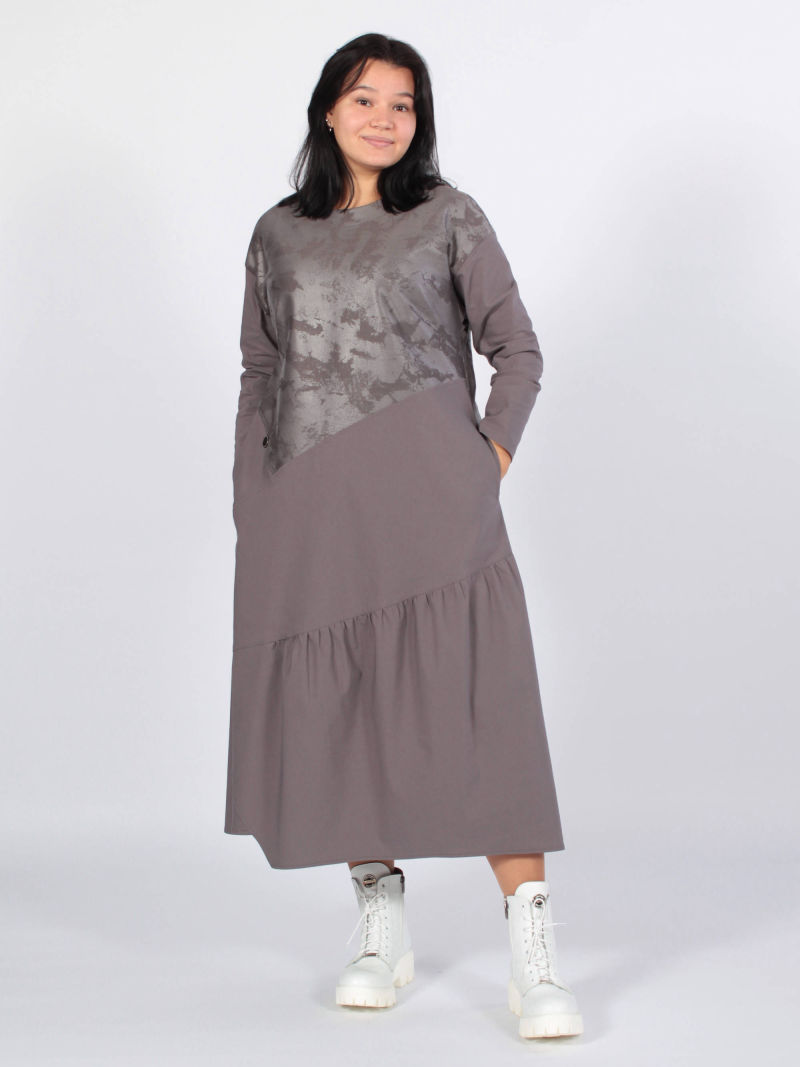 Мы стремились, чтобы красота и удобство сочетались в одном платье. Именно поэтому платье имеет сложный крой и выполнено из разных по фактуре и свойствам тканей. Часть спинки и переда выполнены из трикотажа под кожу. А нижняя часть платья сшита из текстиля со стрейчем, это было нужно для создания красивого объёма и модного силуэта. У платья длинные рукава, слегка спущенное плечо, есть удобные карманы. Такой наряд идеально впишется в базовый гардероб и подойдет на любой сезон. За счет спокойных оттенков подойдет на любое мероприятие: на работу, в офис, свидание, на встречу с подружками, для фотосессии, а если добавить каблук и украшения, то это уже вечернее платье, и подойдет на любой праздник: свадьбу, на Новый год, корпоративы или на день Рождения. Такое платье можно прикупить как подарок маме.