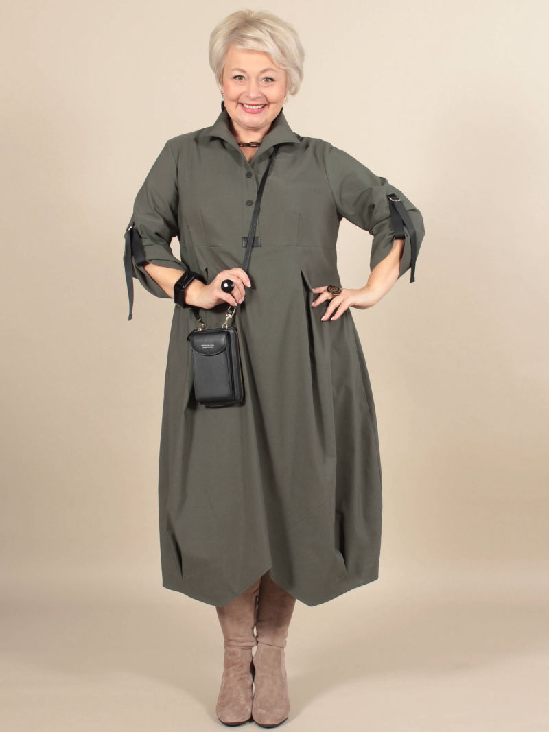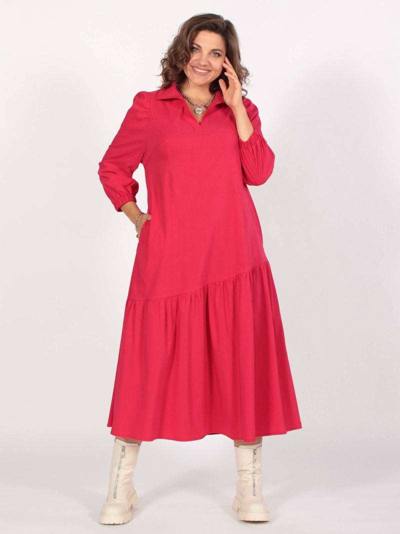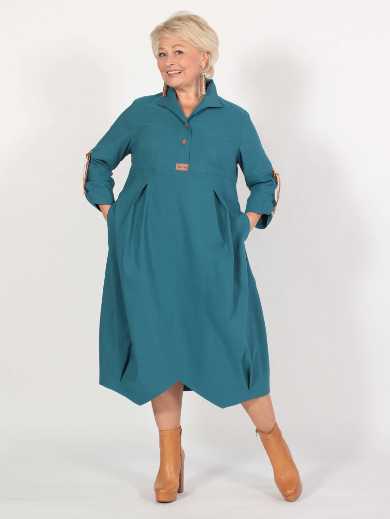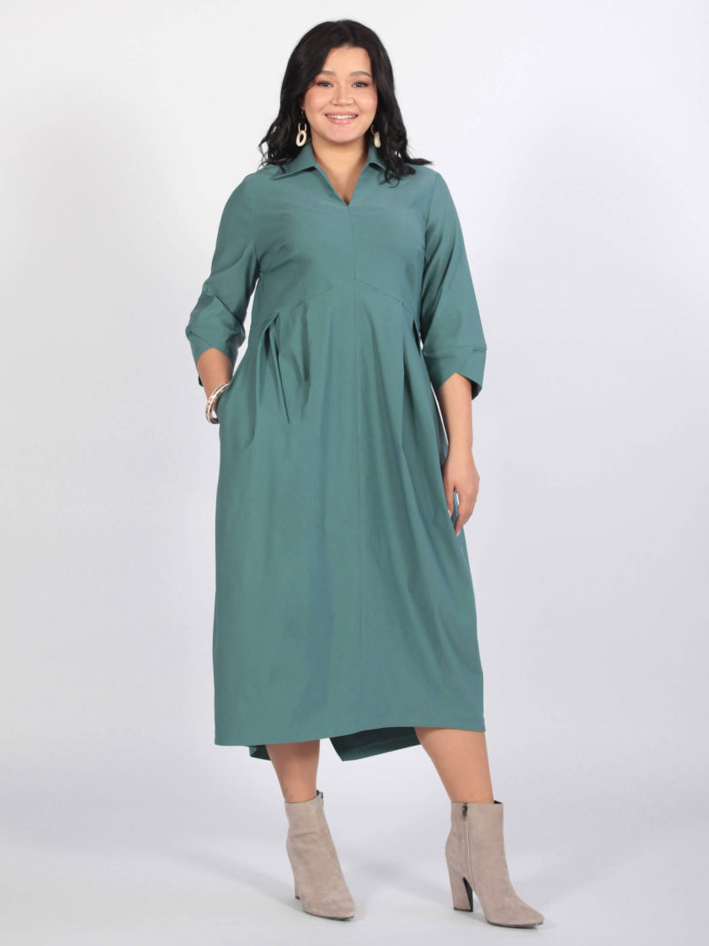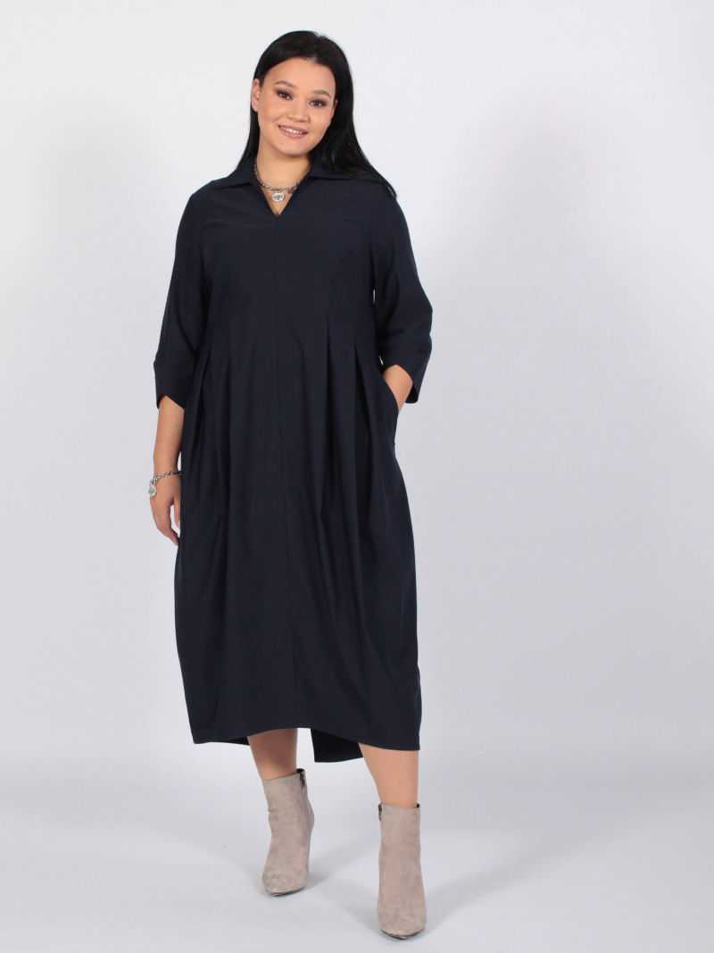 Оригинальное платье из смесовой ткани со стрейчем. Легкий полуприлегающий силуэт перетекает в бокалообразную юбку, зауженную к низу. Косой заостренный подрез под грудью и глубокие складки по переду формируют игривый характер модели, визуально вытягивают и стройнят фигуру. Линия плеча естественная, рукав объемный, зауженный книзу, длиной 3/4. Оригинальные манжеты подчеркивают тонкие запястья. Горловина оформлена воротником и пикантной щелью по центру, переходящей в вертикальный шов переда. Удобные карманы выполнены вдоль боковых швов. Plus size/плюс сайз/большие размеры/для полных женщин/надин оверсайз для девушек/белорусская одежда женская/Беларусь/офисное женское Белоруссия/oversize/турецкая ткань/удлиненный/легкий сарафан/юбка/для подростка школа/для девочки школьная/туника удлиненная/вечернее весеннее осеннее/праздничное/нарядное/торжество