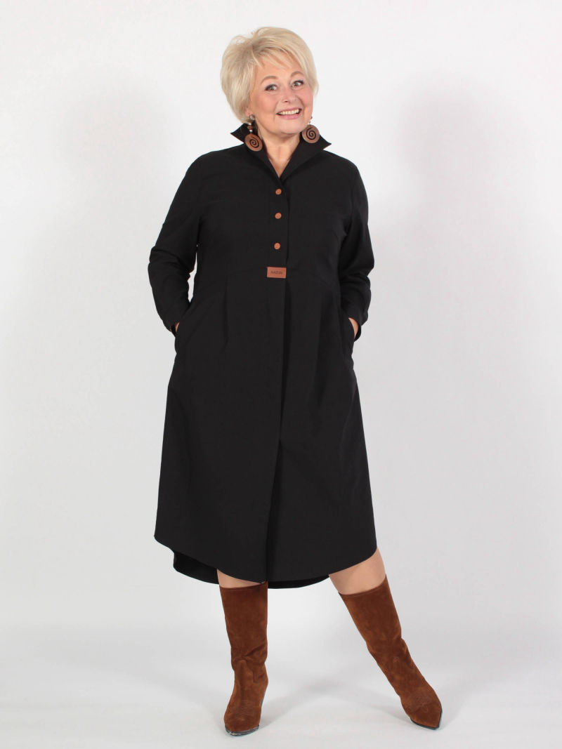 Стильное платье из эластичной смесовой ткани. Воротник-апаш с застежкой на кнопки завершается декоративным фирменным шевроном из экокожи. Фигурный дугообразный подрез выше линии талии визуально вытягивает фигуру и удлинняет ноги, а изогнутая форма низа подчеркивает динамику модели. Перед платья декорирован мягкими складками и вертикальной складкой-шлицей по центру. Вдоль бокового шва выполнены удобные карманы. По спинке вертикальная складка декорирована двумя отделочными кнопками и разрезом-шлицей. Линия плеча естественная, рукав полной длины на притачной манжете с застежкой на кнопку.