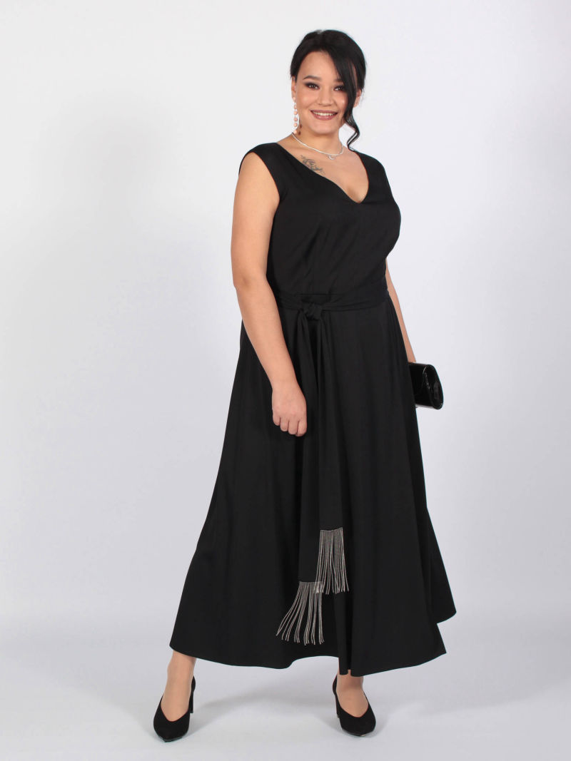 Роскошное длинное платье для торжественных случаев. Платье выполнено из благородного смесового материала с эластаном. Пластичная ткань создает мягкие фалды у ног, а деликатный атласный блеск придает изысканность образу. Подрез по линии талии делит модель на 2 части. Лиф с глубоким V-образным вырезом по переду и спинке визуально вытягивает и стройнит фигуру. Широкая юбка с имитацией запаха со складками и высоким разрезом слева формирует красивые складки и подчеркивает атласный блеск материала. Длинный пояс на талии позволяет сформировать тугой корсет и подчеркнуть талию. Декоративная металлизированная бахрома на концах пояса кокетливо мерцает и добавляет шарм и индивидуальность образу. plus size/плюс сайз/большие размеры/для полных женщин/надин оверсайз для девушки/белорусская одежда женская/Беларусь/Белоруссия/oversize/юбка/нарядное вечернее праздничное черное/осеннее/весеннее/туника удлиненная/женское летнее/платье на Новый год женское 2023/платья на выпускной 9 и 11 класс/8 марта/для подростка