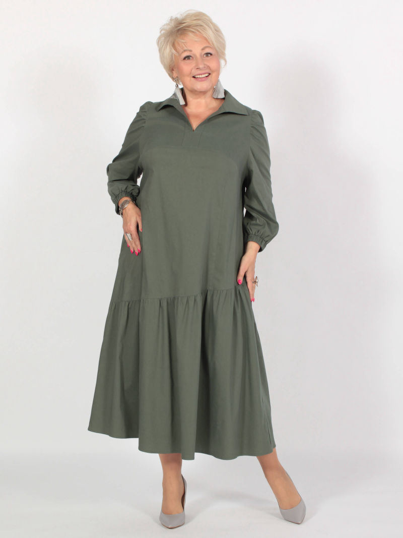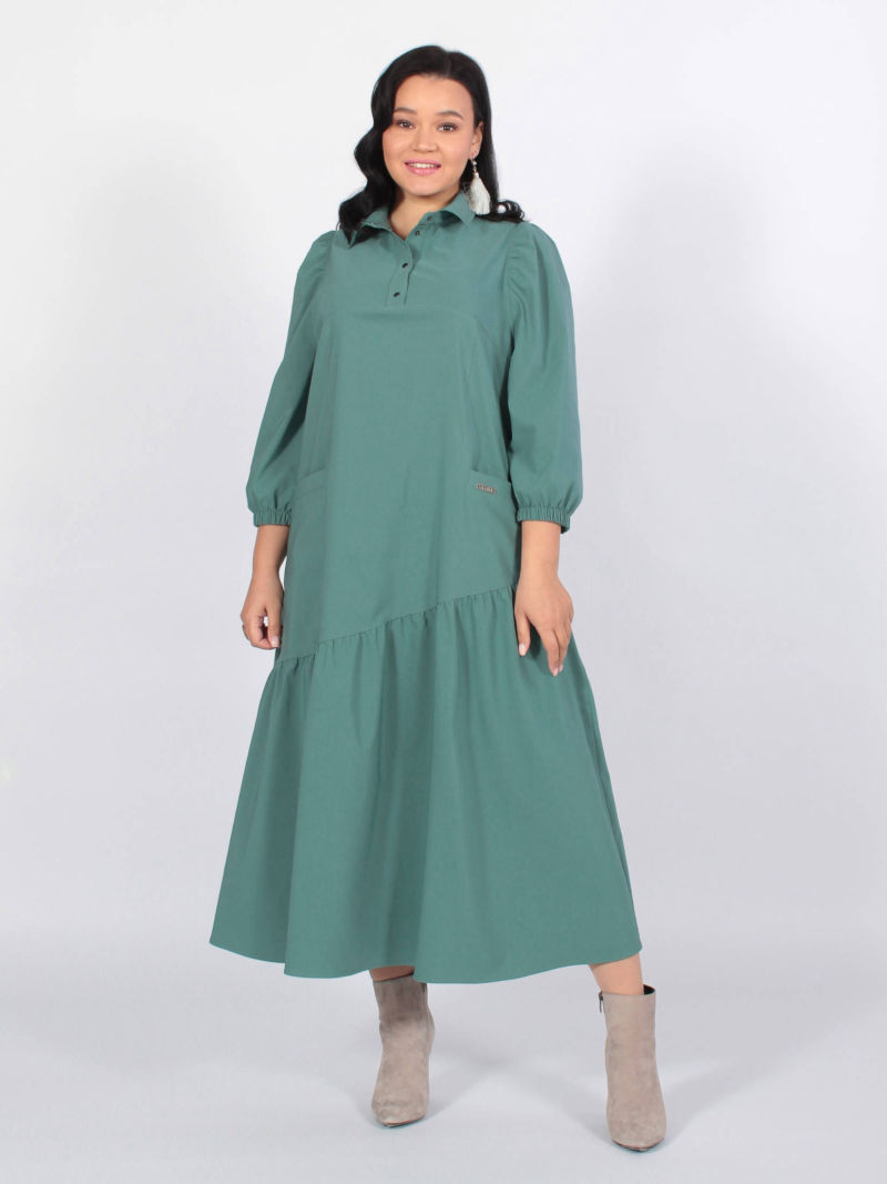 Модное платье из полюбившегося материала хлопка со стрейчем. Ткань тактильно приятная, плательно-блузочная. Платье длинное, в меру свободное, оно сделает ваш образ воздушным и уникальным. У платья отложной воротник, роскошные пышные рукава, симметричный волан по низу, удобные карманы. Такое платье скроет все нюансы фигуры, за счет плавных линий рельефа.