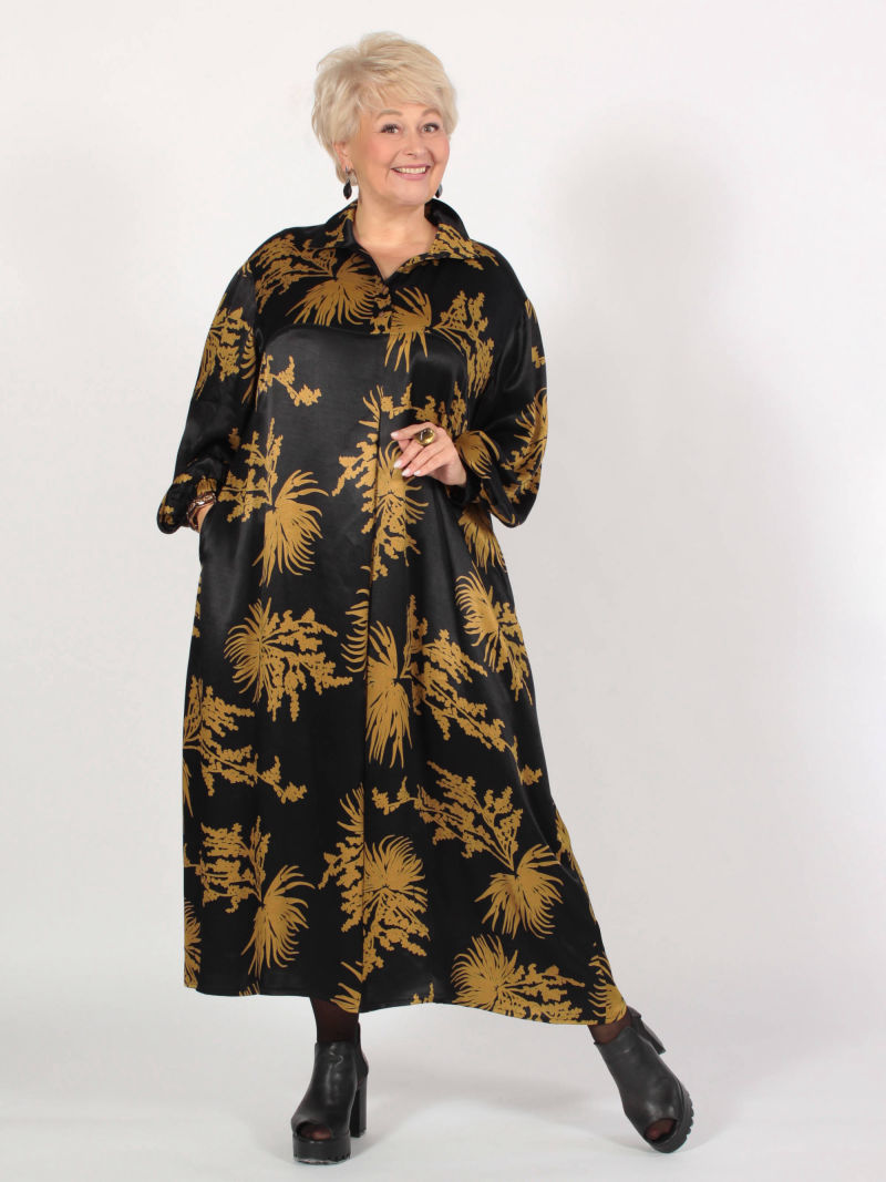 Платье, в которое возможно не влюбиться и пройти мимо. В меру свободное, струящееся из атласного текстиля. Аккуратный отложной воротник на застежке с кнопками, доходящий до отрезной линии груди. Широкий рукав на небольшой манжете с эластичной тесьмой. В боковых швах имеются карманы. как спереди, так и сзади имеются складки, для создания объема и развевающегося силуэта. Низ платья немного фигурный - это сделано с той целью, чтобы не было перекосов и это привносит свою изюминку в своей асимметрии.