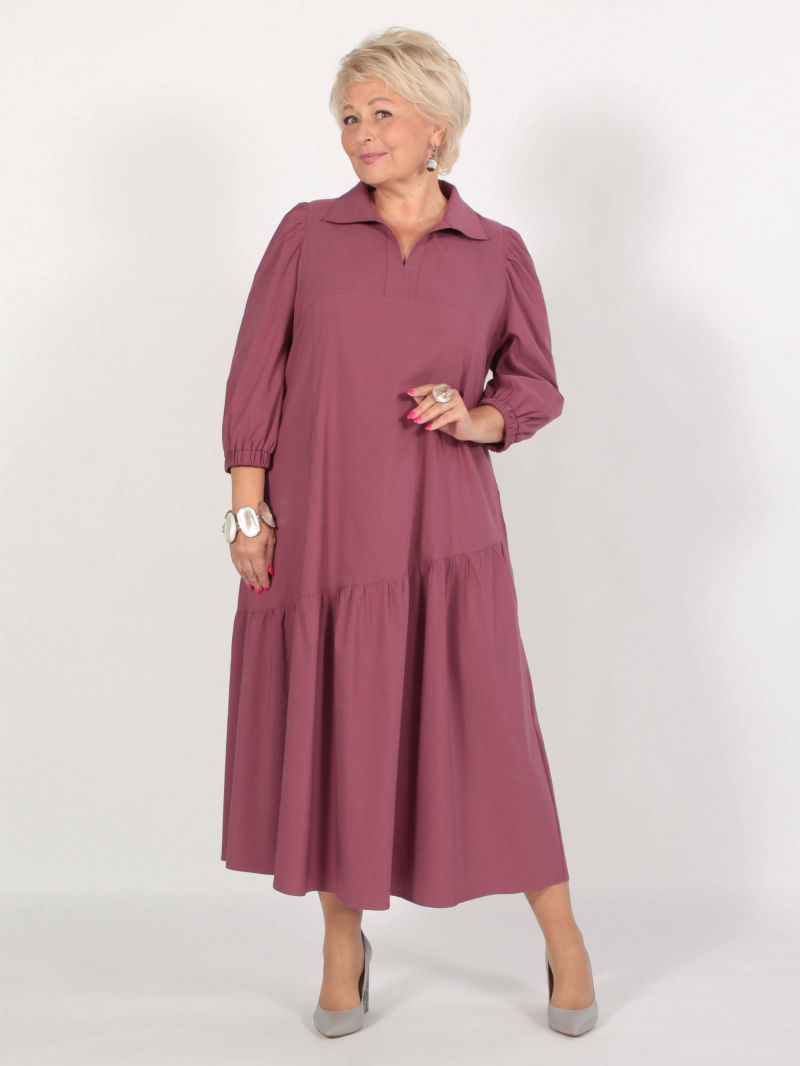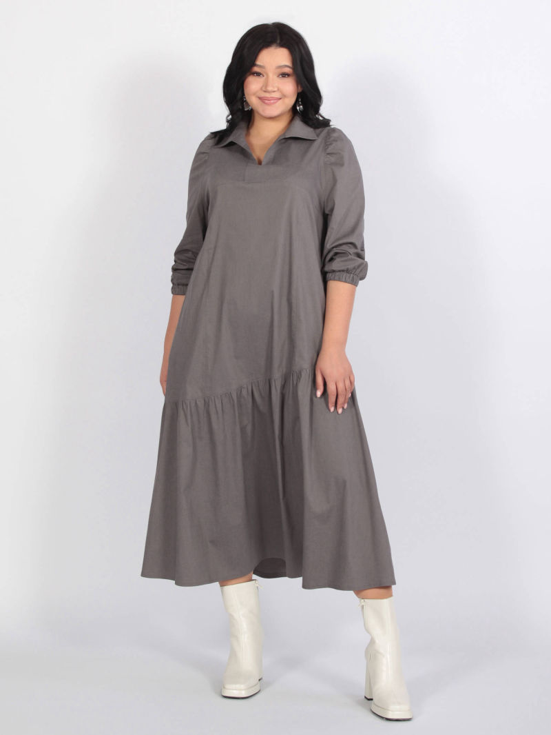 Модное платье из полюбившегося материала хлопка со стрейчем. Ткань тактильно приятная, плательно-блузочная. Платье длинное, в меру свободное, оно сделает ваш образ воздушным и уникальным. У платья отложной воротник, роскошные пышные рукава, симметричный волан по низу, удобные карманы. Такое платье скроет все нюансы фигуры, за счет плавных линий рельефа
