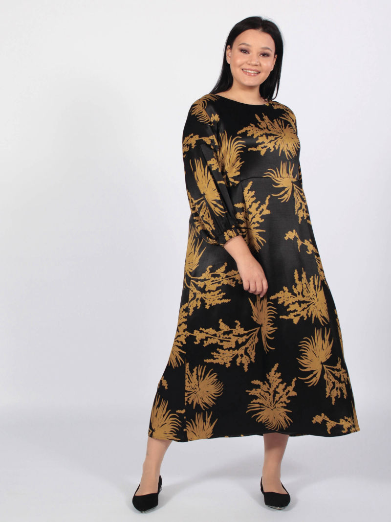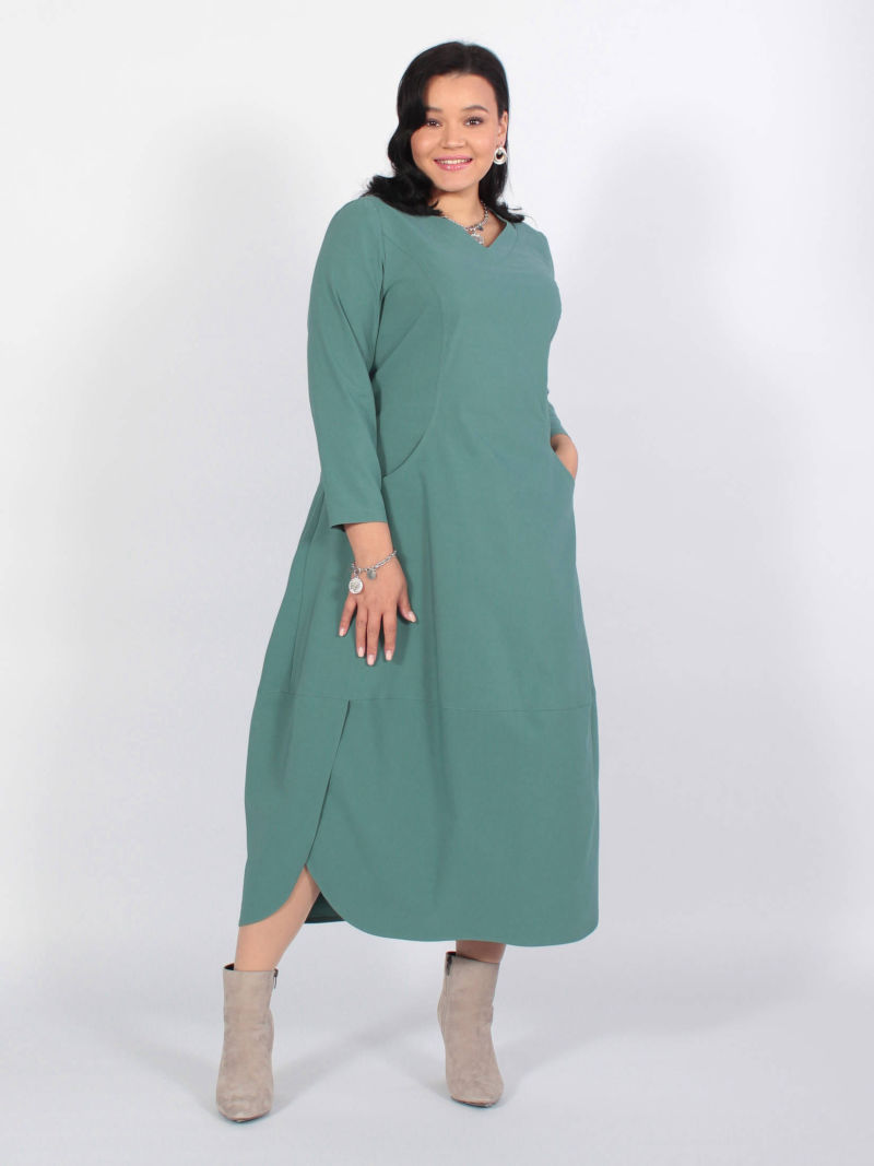 Роскошное платье из плотного вискозного материала со стрейчем и эффектом атласного мерцания. Расширенный А-образный силуэт в сочетании с фактурой материала создает мягкие пластичные фалды у ног. Низ изделия фигурный, дугообразный. Горловина округлой формы с 4-мя мягкими лучеобразными складками. Линия плеча заужена, рукав объёмный, длиной 7/8, со сборкой по окату и складками по низу рукава. Притачная манжета с эластичной резинкой внутри позволяет регулировать длину рукава. Удобные карманы выполнены вдоль боковых швов изделия. РЕКОМЕНДУЕМ выбирать размер этого платья по мерке обхвата груди.