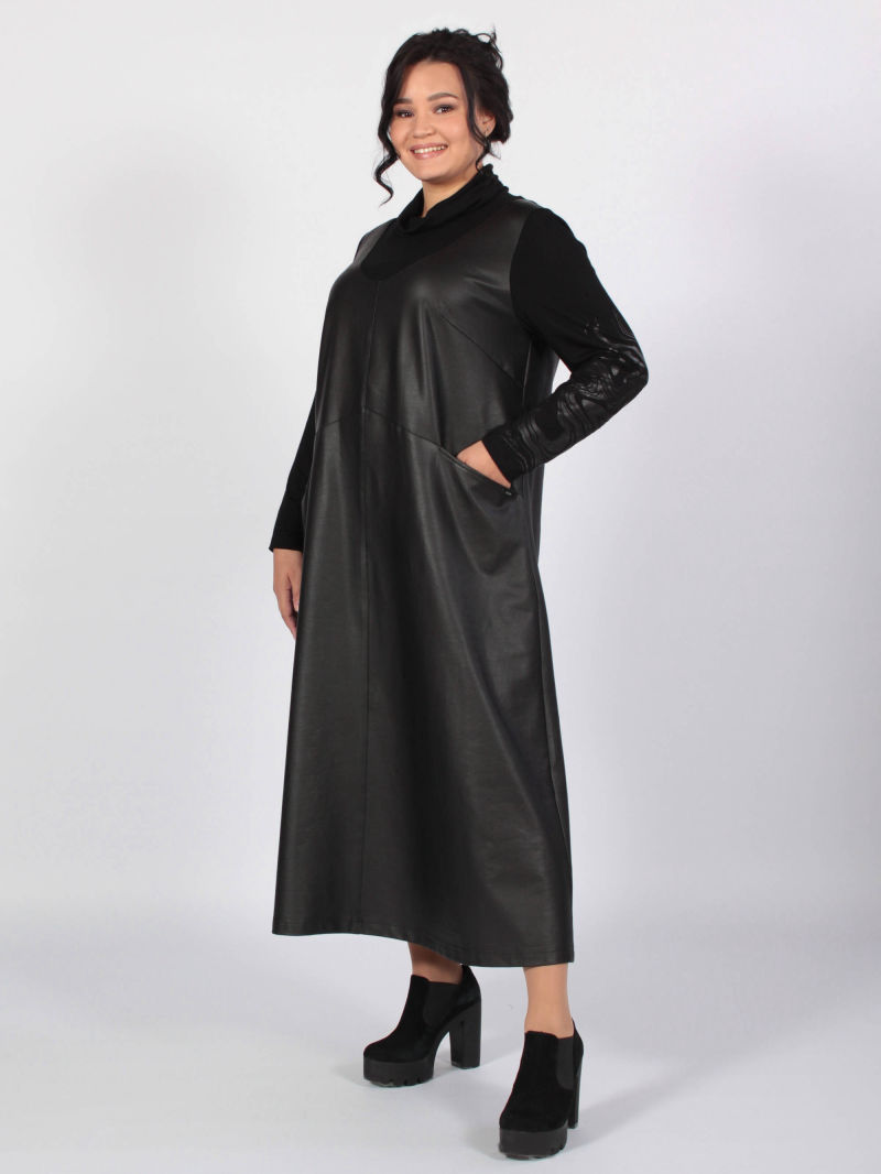 Платье-сарафан А-образного силуэта выполнено из двух тканей: хлопкового трикотажного полотна с покрытием под кожу и мягкого вискозного трикотажа. Комбинация глянцевой и матовой фактур создает иллюзию многослойности и сложности изделия. Левый рукав платья декорирован дерзкой авторской печатью в стиле "тату Маори". Линия плеча естественная, рукав полной длины. Центральные швы переда и спинки визуально вытягивают и стройнят фигуру. В платье есть удобные карманы. Смелый и современный образ не оставит вас незамеченной. Plus size/плюс сайз/большие размеры/для полных женщин/надин оверсайз для девушек/белорусская одежда женская/Беларусь/офисное женское Белоруссия/oversize/турецкая ткань/удлиненный/легкий сарафан/юбка/для подростка школа/для девочки школьная/туника удлиненная/вечернее весеннее осеннее/праздничное/кожа/экокожа/кожаное/черное/кожа / кожаное платье/