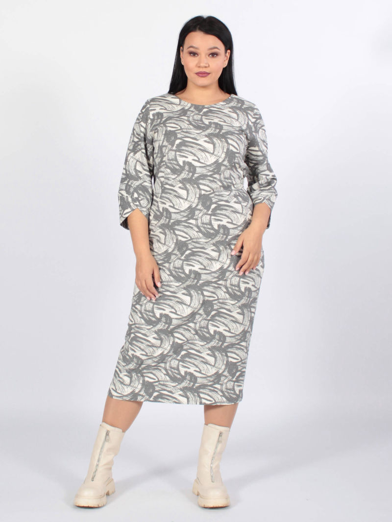 Базовое трикотажное платье-футляр элегантной длины, ниже колена, полуприлегающего силуэта из принтованного трикотажного полотна. Горловина округлой формы-лодочка, линия плеча естественная, рукав длиной 3/4 с оригинальной притачной манжетой в форме лепестка на запах. Plus size/плюс сайз/большие размеры/для полных женщин/надин оверсайз для девушек/белорусская одежда женская/Беларусь/офисное женское Белоруссия/oversize/турецкая ткань/для подростка школа/для девочки школьная/туника/ блузка женская/ брюки женские/