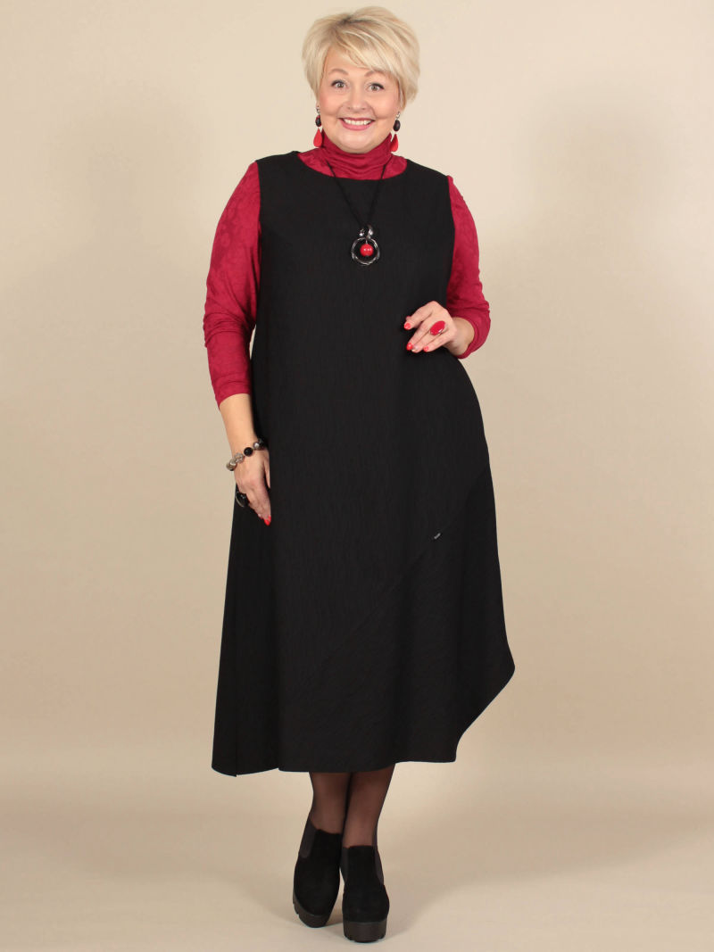 Сарафан А-силуэта с асимметричным подрезом по низу слева. Пластичный материал со стрейчем отлично облегает фигуру и создает мягкие фалды у ног. Углубленная пройма позволяет легко комплектовать сарафана с блузкой, футболкой или с джемпером. Косой подрез по низу изделия подчеркивает фактуру материала, а треугольный разрез пикантно приоткрывает ножку. В боковых швах выполнены удобные карманы. Горловина округлой формы-лодочка. plus size/плюс сайз/большие размеры/для полных женщин/надин оверсайз для девушек/белорусская одежда женская/Беларусь/офисное женское/свитер Белоруссия/oversize/юбка
