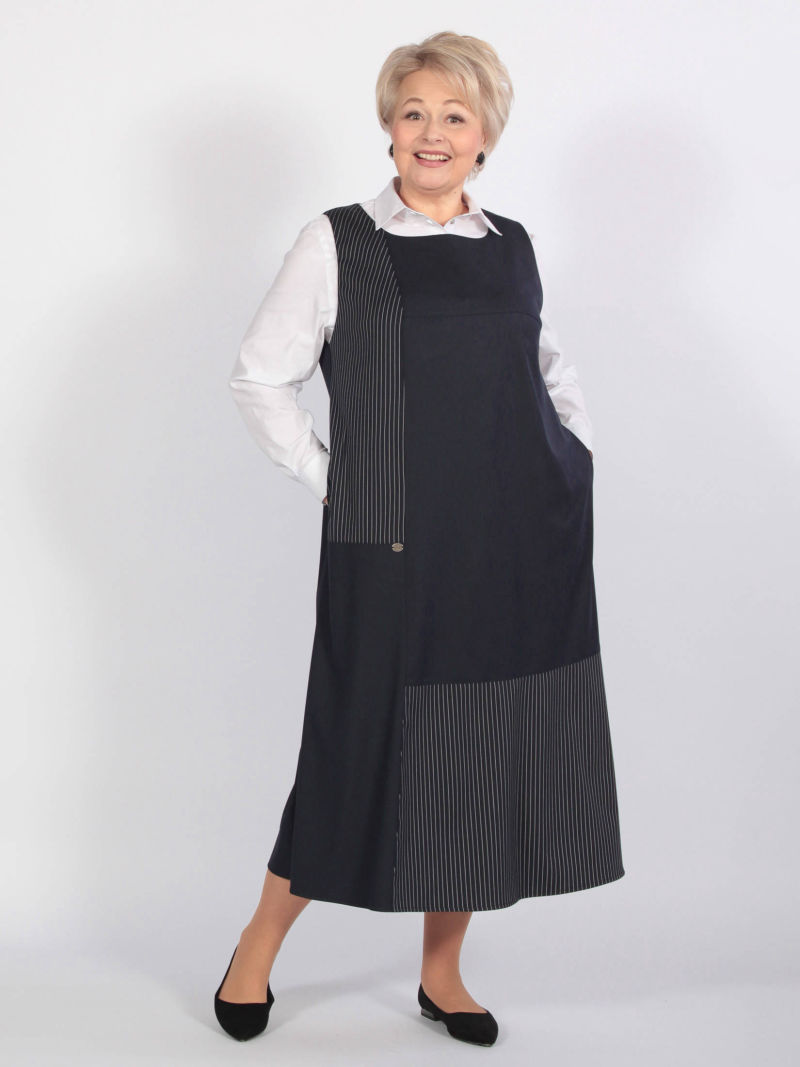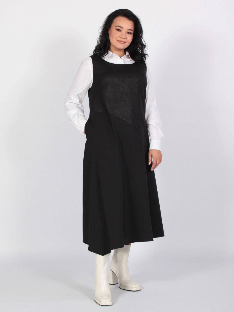Сложный в крое и в тоже время вполне классический сарафан из нескольких видов ткани. Верх сарафана сделан из трикотажа, что делает вещь очень удобной. Низ сарафана выполнен из текстиля, а в качестве отделки присутствует вставка из ткани под кожу. Сарафан вмеру облегающий по силуэту и раширяющийся к низу за счет сложных конструкторских линий. Есть удобные карманы. Plus size/плюс сайз/большие размеры/платья для полных женщин/надин оверсайз для девушек/белорусская одежда женская/Беларусь/офисное женское Белоруссия/oversize/турецкая ткань/удлиненный легкий/юбка/для подростка школа/для девочки школьная/туника удлиненная/вечернее весеннее осеннее платье/праздничное платье с коротким рукавом сарафан/деловое офис/кожа/кожаное/блузка.